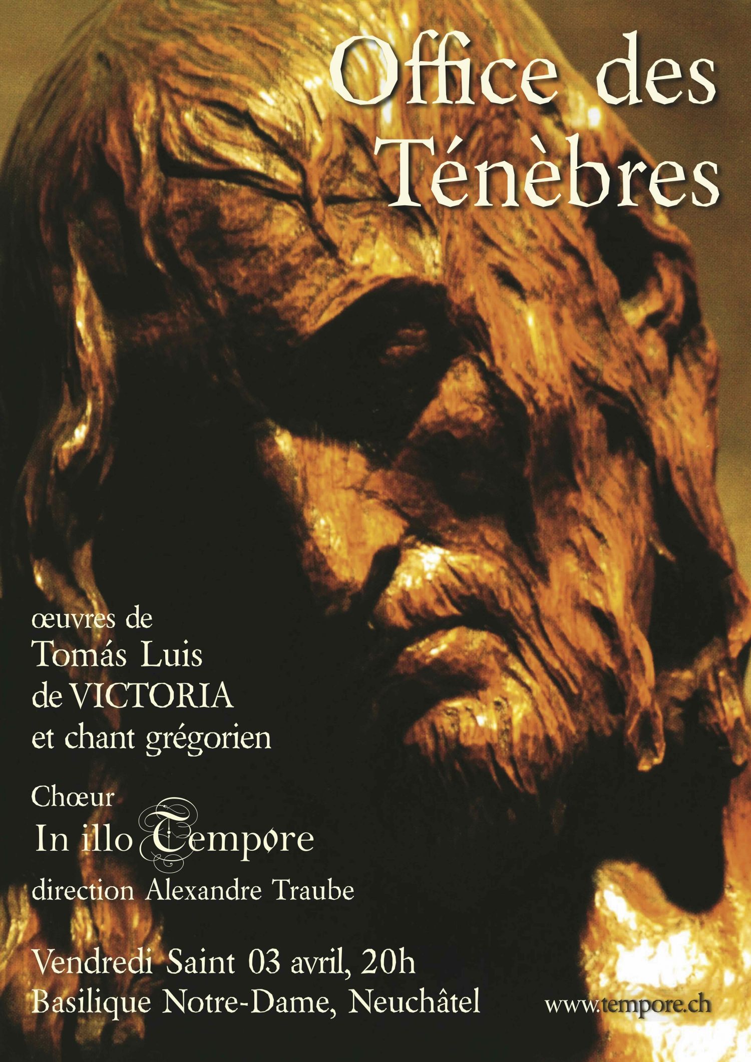 Le chœur In illo tempore, sous la direction d'Alexandre Traube, a l'immense plaisir de renouer cette année avec une tradition qui lui est chère : chanter l'Office des Ténèbres du Samedi saint (Mise au tombeau) à la basilique Notre-Dame de Neuchâtel.