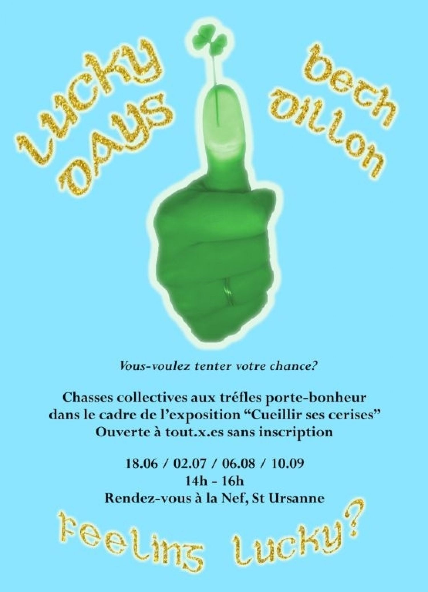Chasses collectives aux tréfles porte-bonheur dans le cadre de l'exposition "Cueillir ses cerises". Ouverte à tout.x.es sans inscription.
