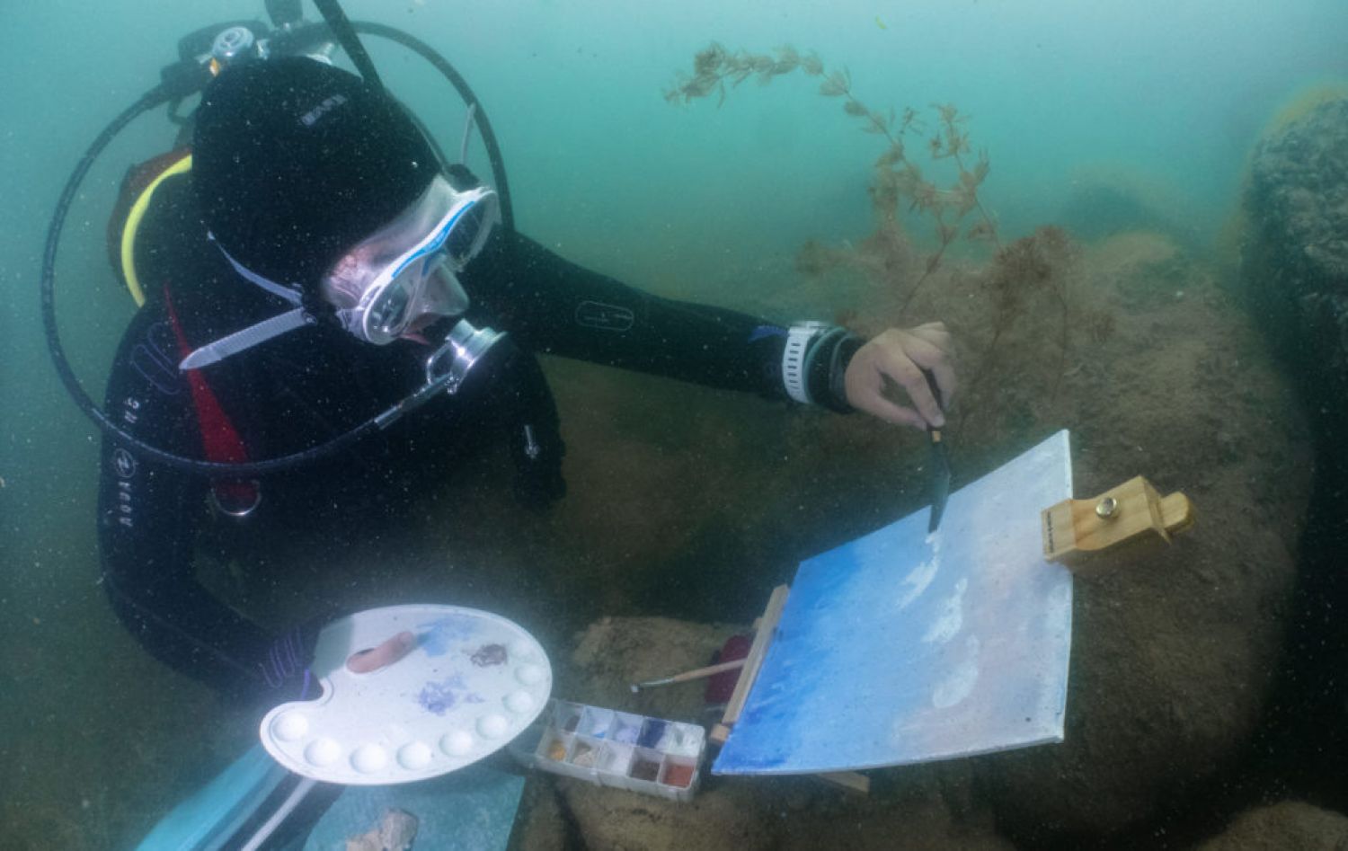Fannylla est l’une des lauréat-es du programme « Artiste en résidence » de la Ville de Neuchâtel, grâce auquel elle a pu déposer en juin dernier ses toiles, ses pinceaux et son matériel de plongée dans le cabanon romain du parc archéologique. Elle y a développé une technique innovante de peinture écoresponsable qui lui permet d'aller faire des toiles sous l'eau. Cet objectif désormais atteint, elle se consacre maintenant à la création de ses œuvres subaquatiques jusqu’à la fin de sa résidence, prévue début octobre.