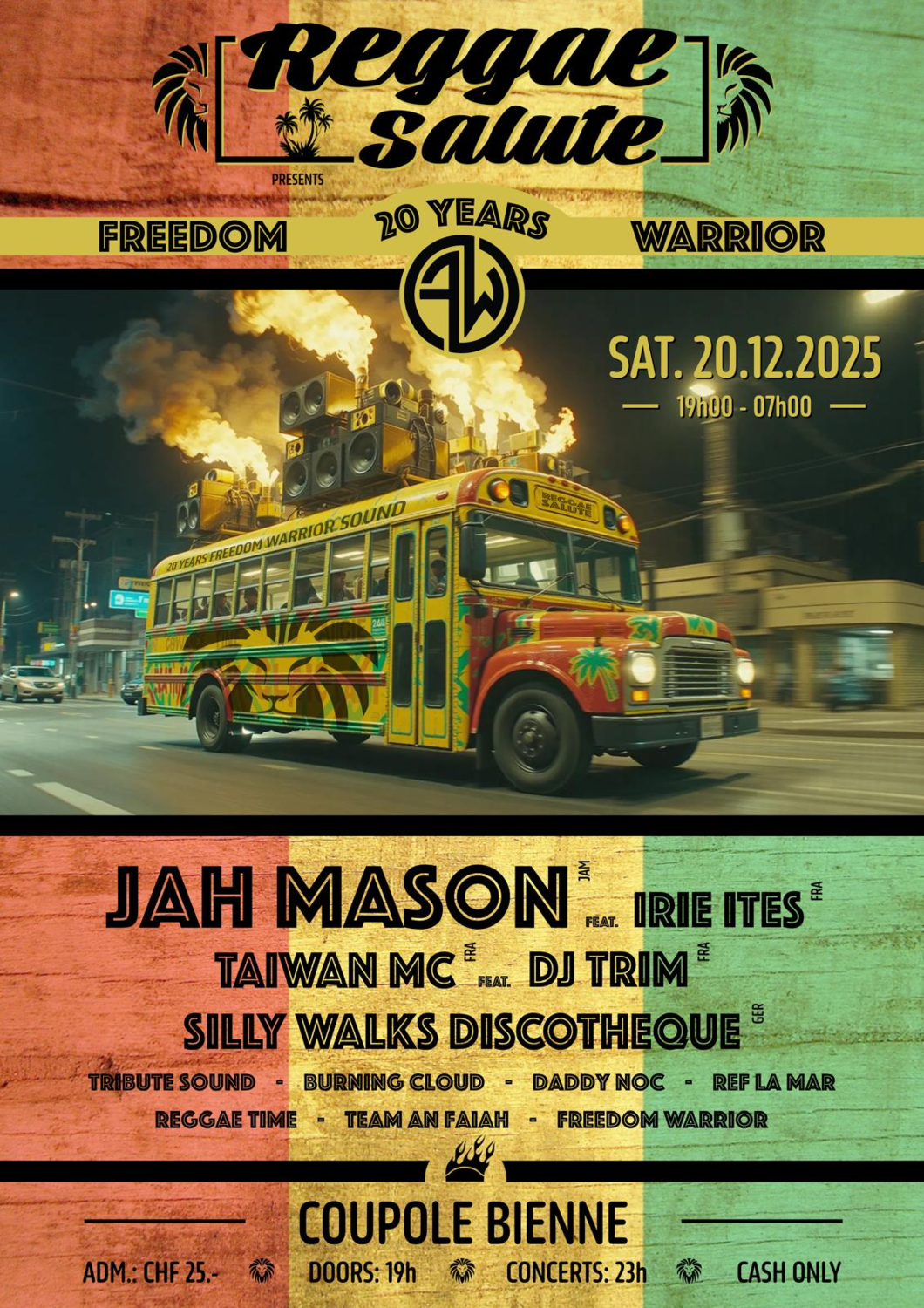 Depuis déjà 20 ans, ce son résonne dans les fêtes et les festivals, et depuis 12 ans, FreedomWarriorSound organise des soirées. La Coupole à Bienne est l'endroit idéal pour passer une nuit reggae inoubliable !