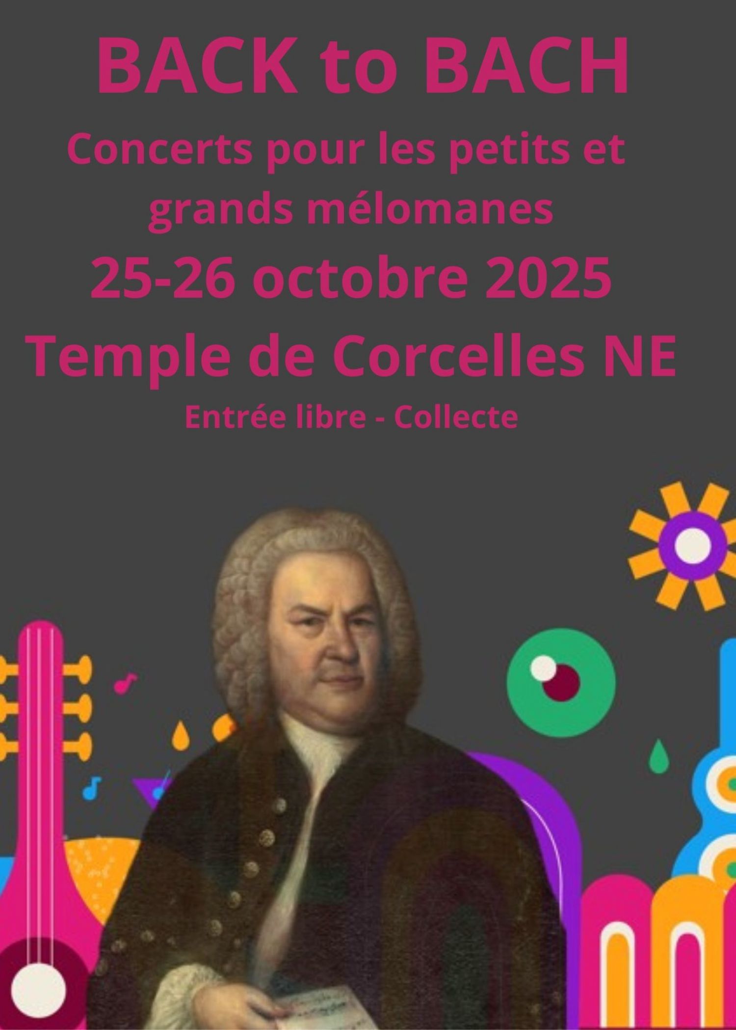 Une petite série de concerts dans le cadre enchanteur du Temple de Corcelles, placée sous le signe de Jean-Sebastien Bach. La vie de la famille Bach sera racontée en musique et en images lors des concerts pour enfants. Un dialogue rare entre la viole de gambe et le violoncelle permettra de découvrir deux instruments cousins, tour à tour solistes et complices. Enfin, les cordes pincées seront mises à l'honneur grâce à l'alliance subtile du théorbe et du clavecin historique (1760).