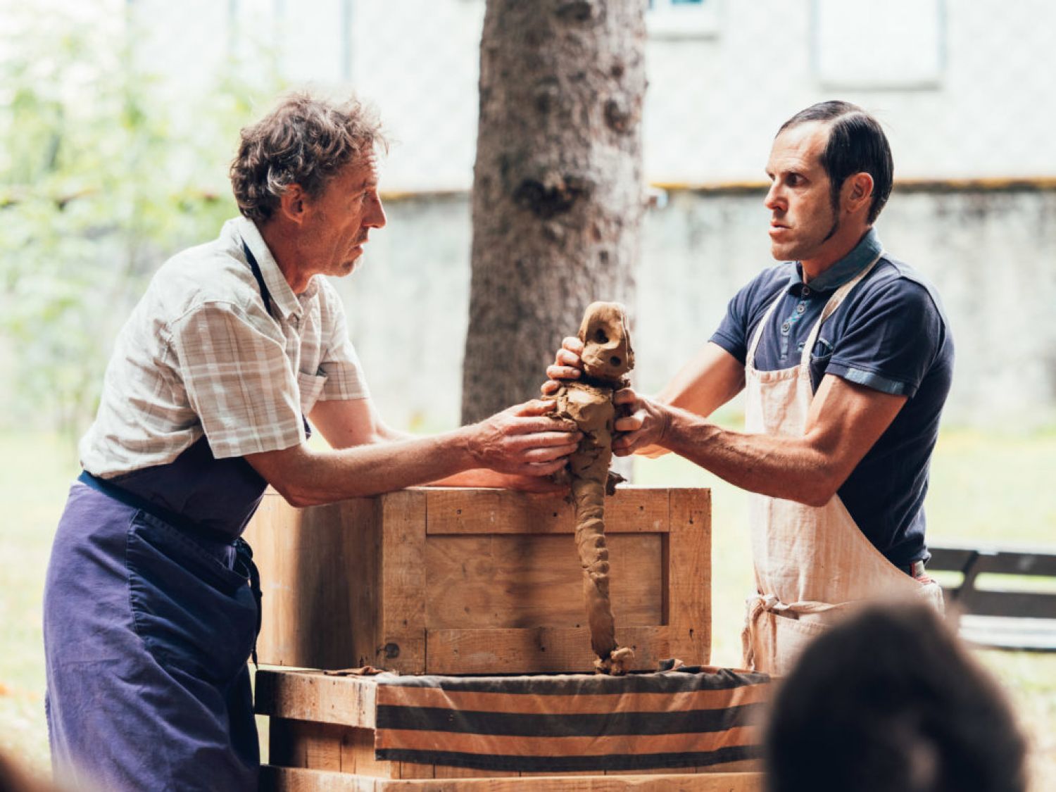 Deux personnages modèlent des marionnettes dans l’esprit burlesque du théâtre corporel.