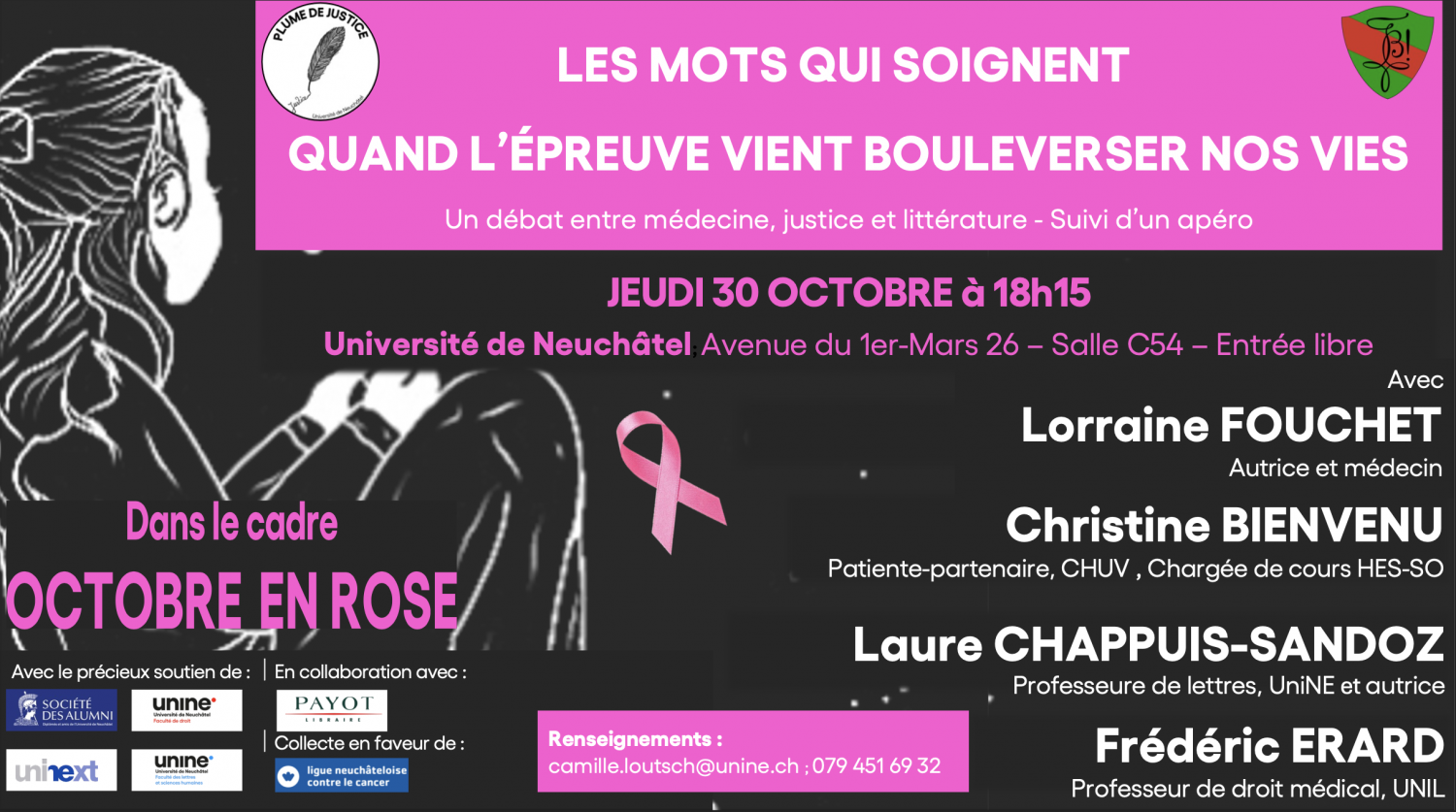 Ce débat Plume de Justice a comme invitée d’honneur l’une des autrices françaises les plus célèbres de France, Lorraine Fouchet. Dans son roman « La mélodie des jours », elle raconte le parcours de combattant qu’une femme a dû traverser dans l’épreuve de la maladie du cancer du sein. Ce débat, organisé dans le cadre du mouvement « Octobre rose » en collaboration avec la Ligue neuchâteloise contre le cancer, nous fera partager les moments de doutes, d’espoir, mais aussi de résilience que toute épreuve – maladie et deuils – nous fait vivre. Aux côtés des intervenant-e-s à ce débat, Lorraine Fouchet échangera avec nous sur les épreuves qui bouleversent la vie grâce à son expérience d’autrice, mais également d’ancienne médecin. Ils échangeront avec nous sur les épreuves qui bouleversent nos vies, celles de nos proches et qui changent le regard des autres et le regard sur soi... Ce sera l'occasion aussi de briser les tabous, de partager les expériences, d'oser exprimer les sentiments si difficiles, mais si importants pour toutes et tous.