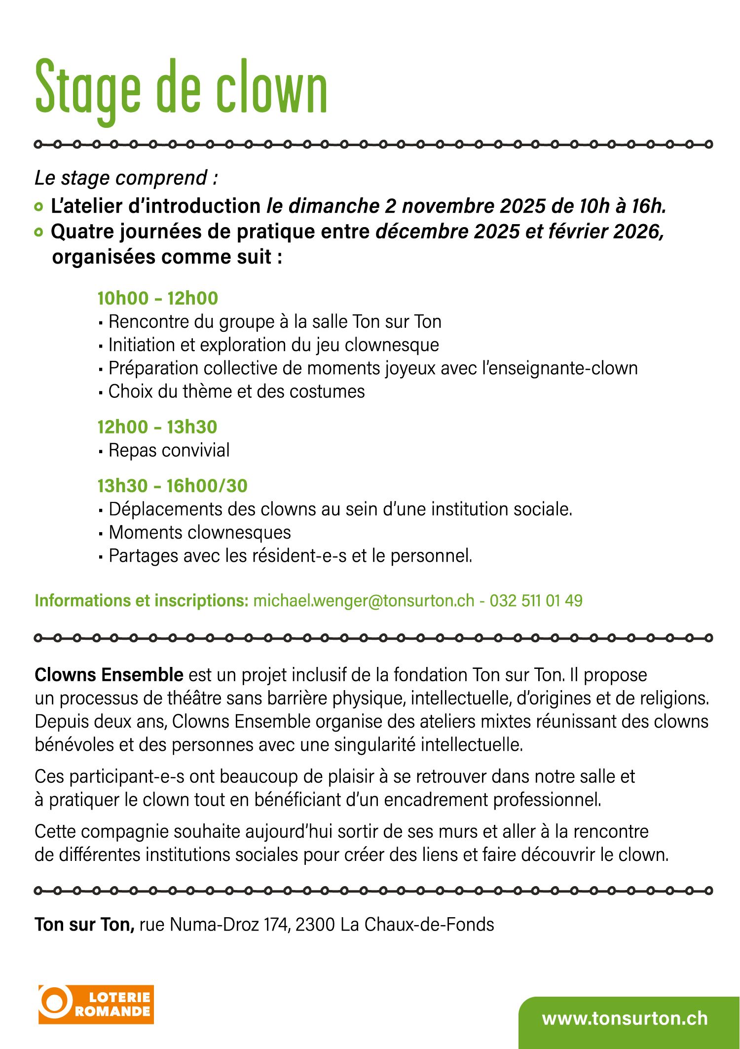 Une première journée d’introduction et de stage de clown qui se déroulera le 2 novembre 2025, à Ton sur Ton.