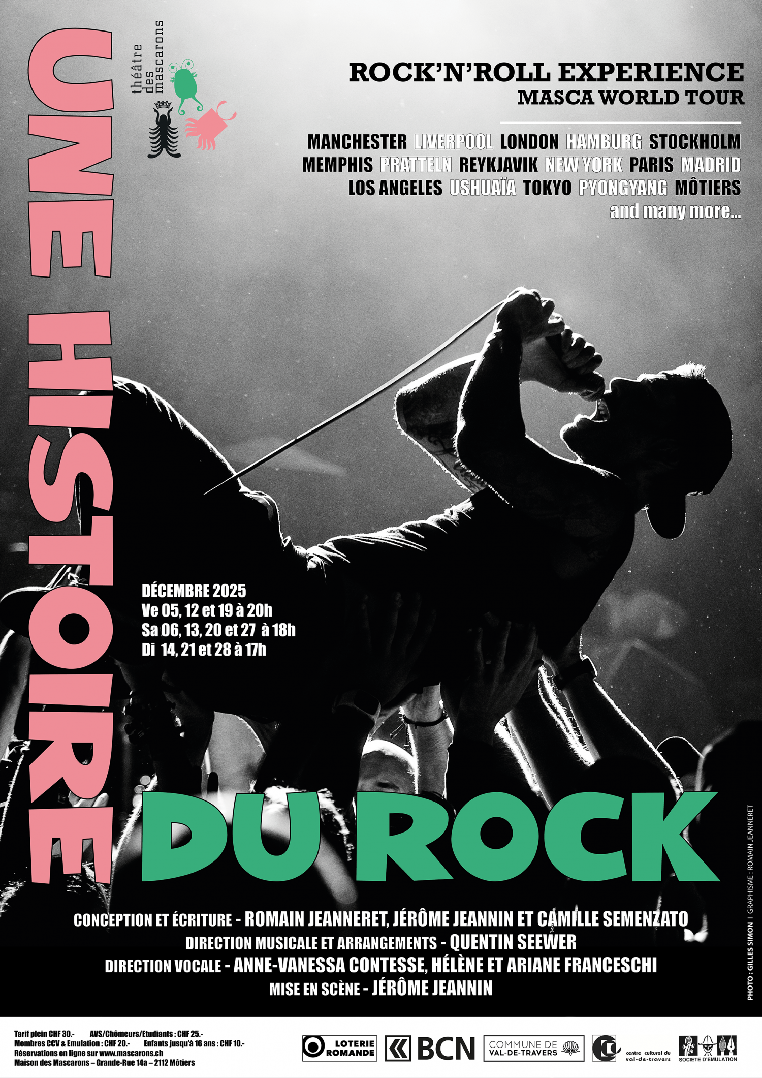 En septante ans, le rock and roll a cristallisé la révolte de la jeunesse et l’émancipation des noirs, la libération des corps et l’ouverture des esprits. De Bill Haley à Kurt Cobain, cette musique juvénile et spontanée s’est faite hurlante, mielleuse, harmonique, revendicatrice, psychédélique, conceptuelle, rageuse, saturée et métissée. C’est cette histoire passionnante que les Mascarons revisitent, grâce à quinze comédiens-chanteurs et des musiciens professionnels.