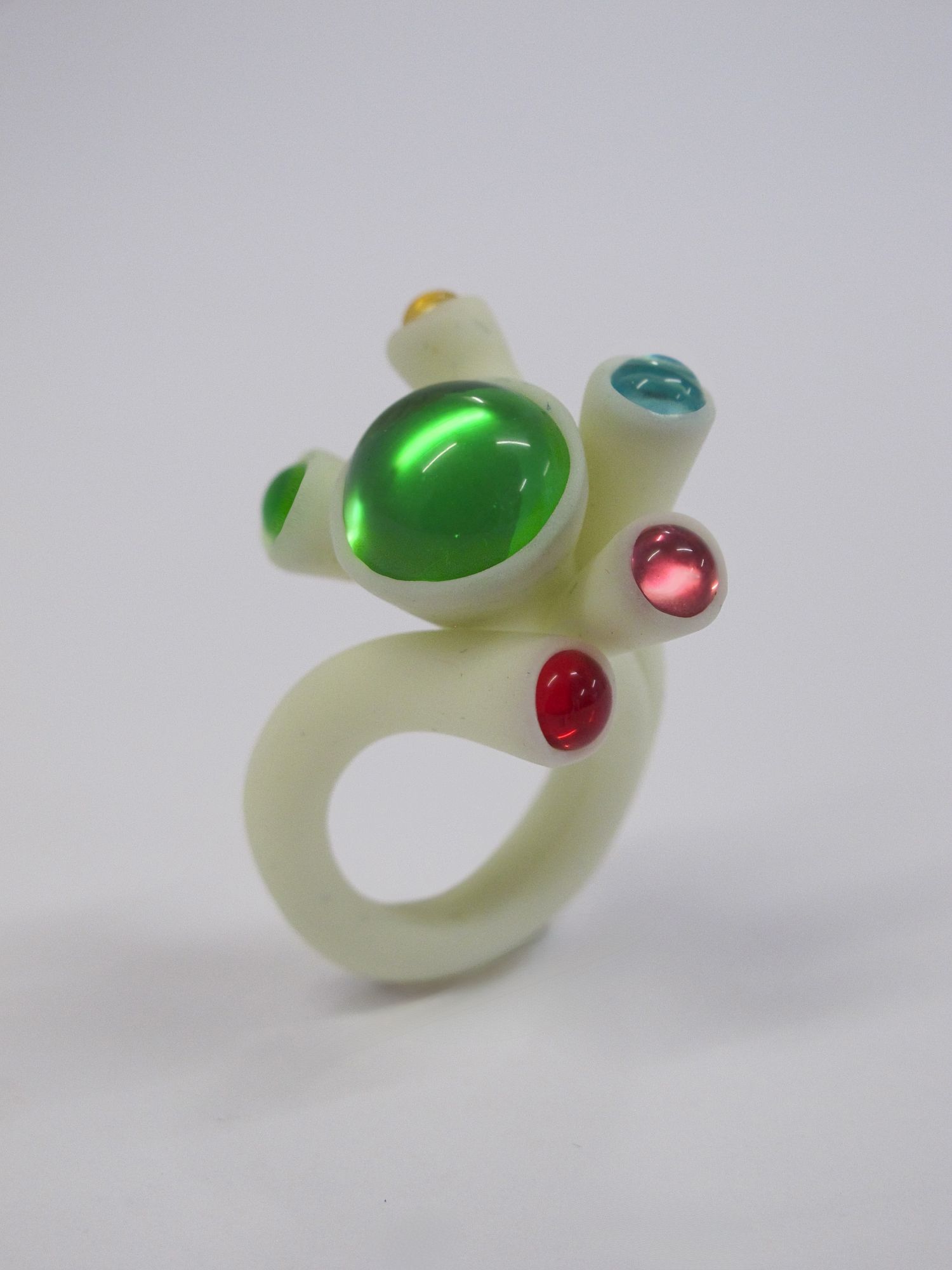 En utilisant cette résine polymère de prototypage comme matériau final qu’il magnifie dans un geste spontané, Denis Tcheskiss pose un acte politique assumé : le prototype devient l’œuvre, court-circuite le processus traditionnel de la joaillerie et le libère des contraintes du luxe. Les sculptures-bijoux (4 à 6 cm) intègrent les mêmes cabochons de verre de Bohème que Luckynut vingt-cinq ans plus tôt, des zirconiums, deux scapolites jaunes taillées par un artiste qu’il a formé. Au centre de l’exposition trône une pièce majeure.