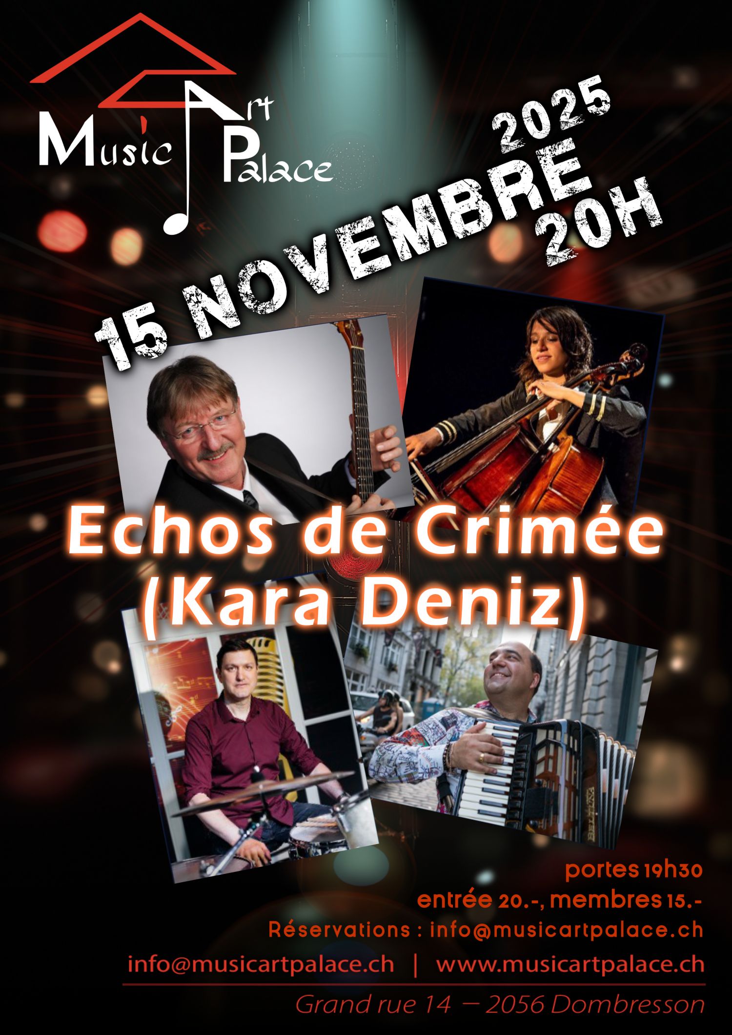 Un voyage dans la tradition musicale tatare avec des rythmes asymétriques et des improvisations teintées de jazz. Ensemble composé de Enver Izmaylov (guitare), Sergiu Popa (accordéon), Noémy Braun (violoncelle) et Ayder Ashyrov (batterie).