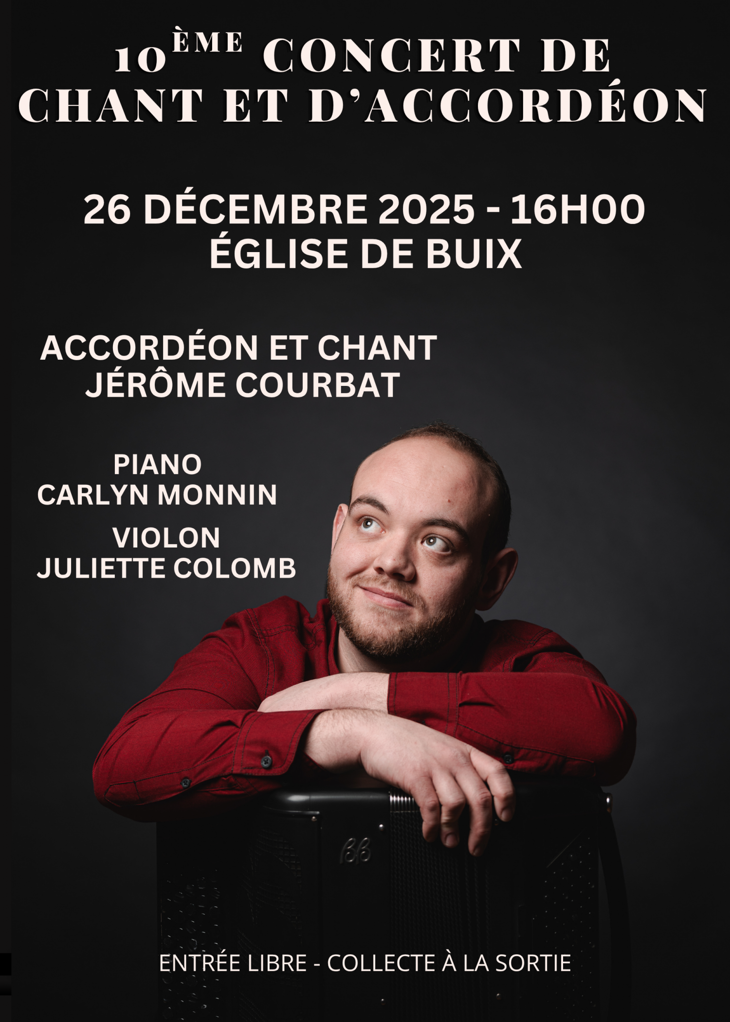 Venez découvrir le 10ème concert de chant et d'accordéon de Jérôme Courbat. Pour la partie vocale, vous pourrez entendre des chansons de la variété française avec Carlyn Monnin à l'accompagnement au piano. Pour la partie instrumentale, Jérôme se produira notamment en duo avec la violoniste Juliette Colomb dans un programme riche et varié. Biscuits, thé et vin chaud à la sortie