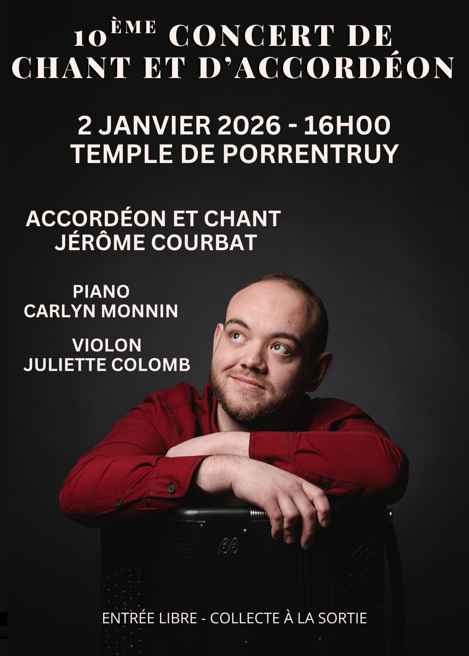 Venez découvrir le 10ème concert de chant et d'accordéon de Jérôme Courbat. Pour la partie vocale, vous pourrez entendre des chansons de la variété française avec Carlyn Monnin à l'accompagnement au piano. Pour la partie instrumentale, Jérôme se produira notamment en duo avec la violoniste Juliette Colomb dans un programme riche et varié. Biscuits, thé et vin chaud à la sortie