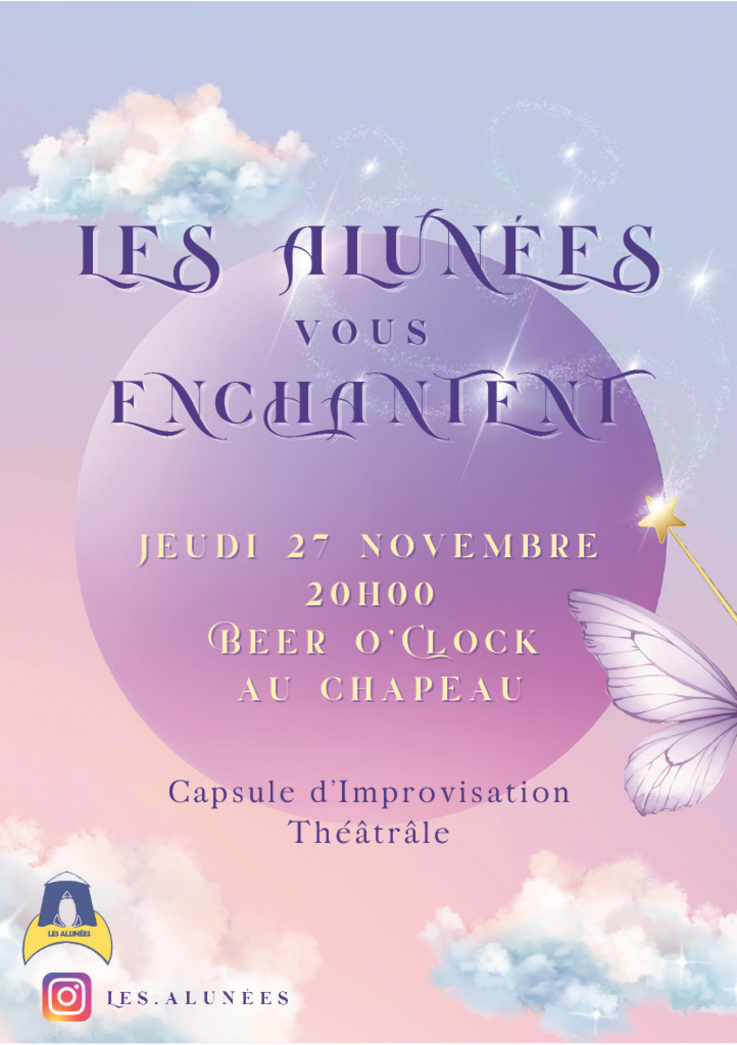Les Alunées vous proposent un nouveau spectacle d'improvisation théâtrale au Beer O'Clock, début 20h00, prix au chapeau.