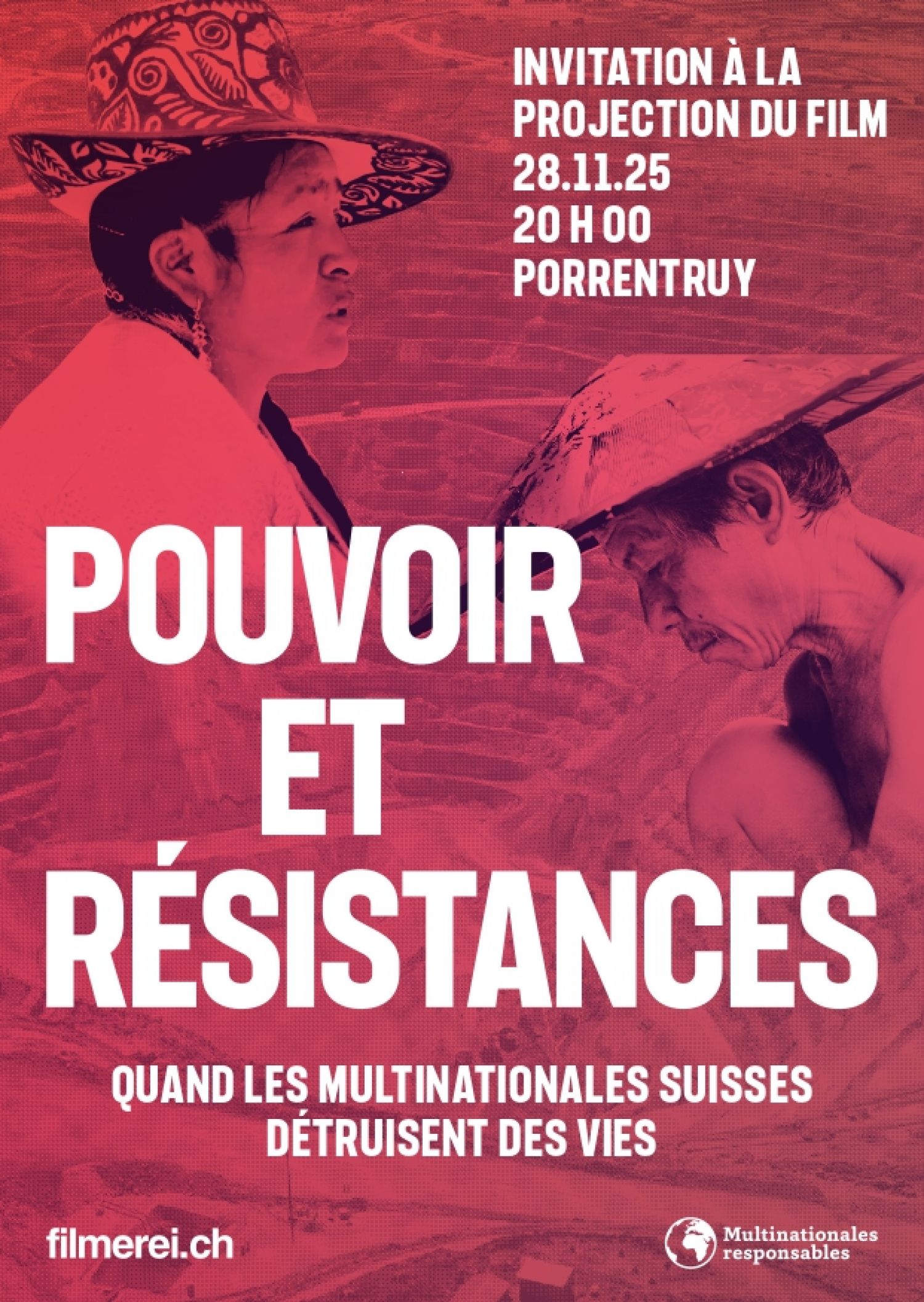 Le film documentaire Pouvoir et résistances : quand les multinationales suisses détruisent des vies présente deux lieux séparés par 18 000 kilomètres, la province andine d’Espinar et la forêt tropicale de l’île de Bornéo, en Asie du Sud-Est. Deux régions éloignées, mais unies par la lutte de leurs communautés indigènes contre une gigantesque mine contrôlée depuis la Suisse. Le film est en espagnol et en dayak avec des sous-titres en français (60 min). Le film sera suivi d'une brève présentation sur l'initiative pour des multinationales responsables ainsi que d'un débat animé par Baptiste Laville du Bruno Manser - Fonds. L'entrée est gratuite, mais l'accès n'est garanti qu'avec une inscription préalable.