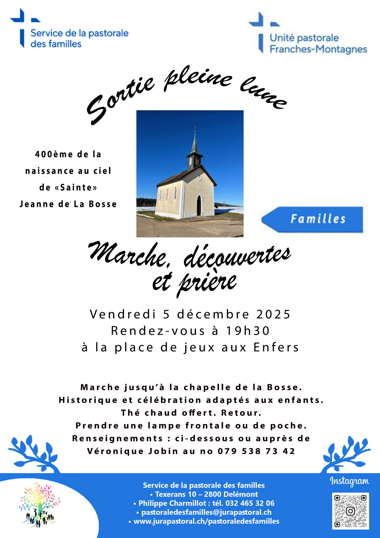 Départ à 19h30 de la place de jeux des Enfers, marche jusqu'à la chapelle de La Bosse, historique du lieu, méditation, thé offert et retour.