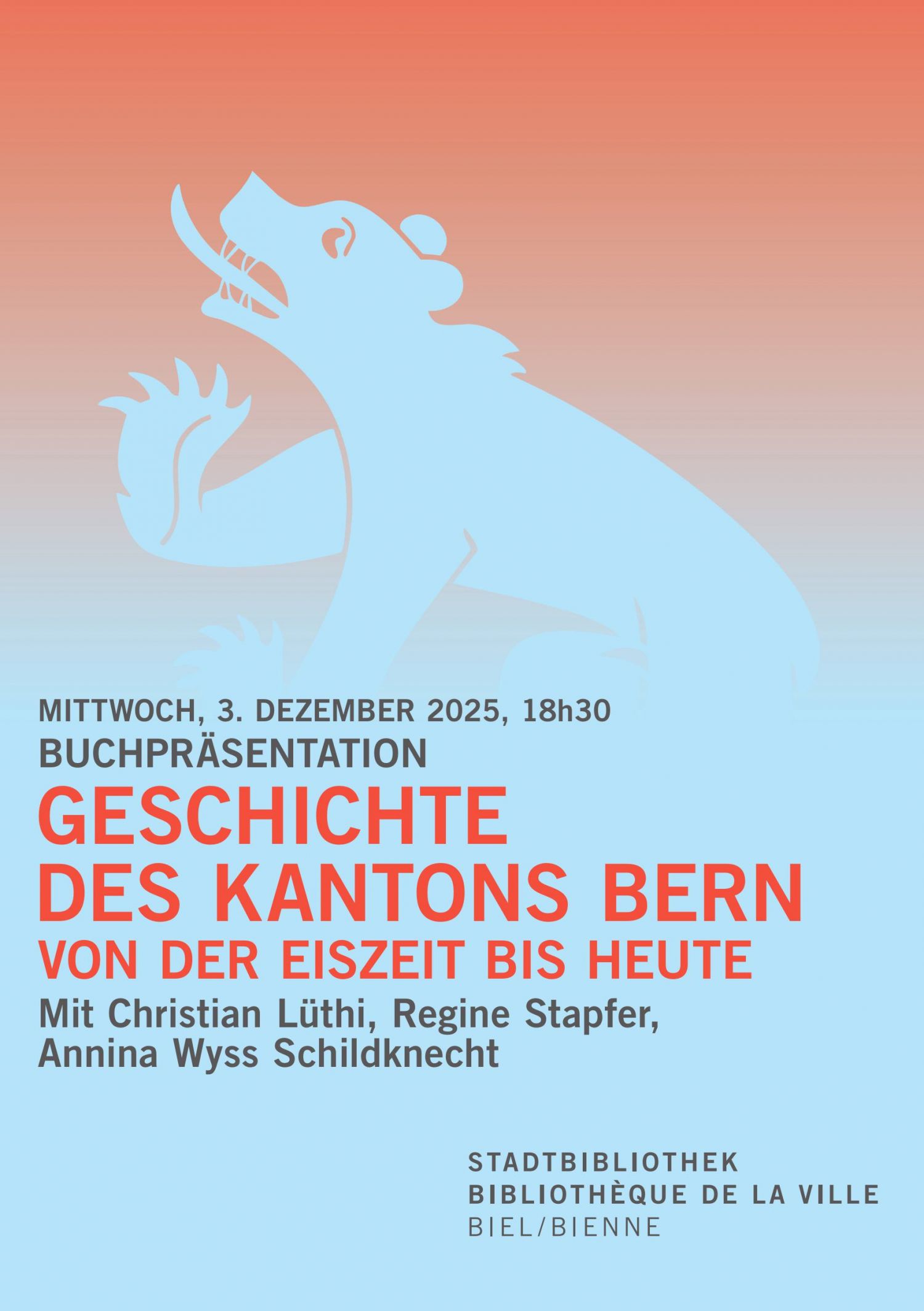 Drei der sechs Autor:innen präsentieren ein neues Buch, das erstmals einen handlichen Überblick zur Geschichte des Kantons Bern bietet. Sie zeigen bei der Präsentation Highlights aus den verschiedenen Epochen und nehmen Bezug auf die Region Biel-Seeland.