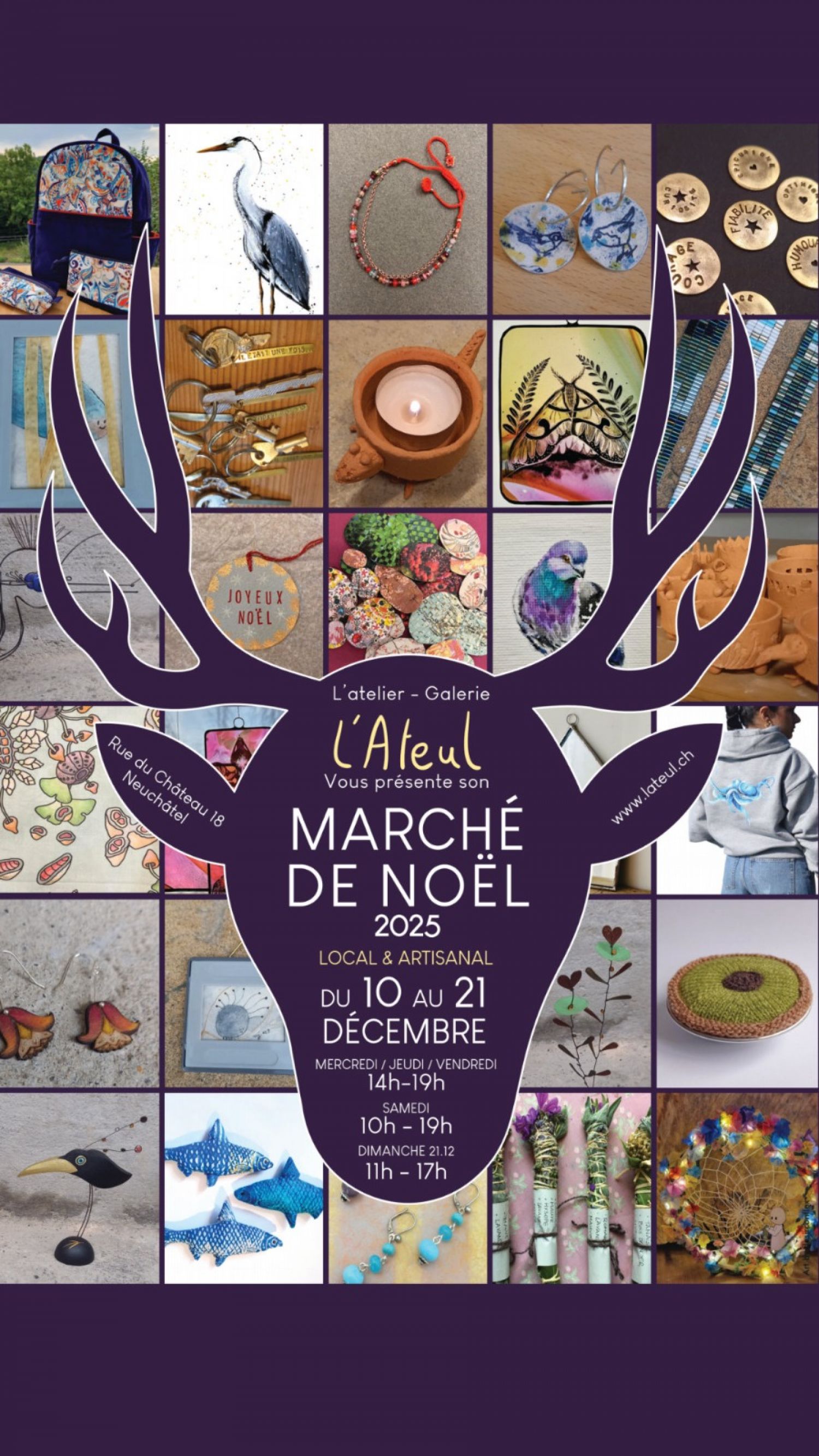 Dans un atelier-galerie chaleureux et atypique, situé en vielle ville de Neuchâtel, une vingtaine de créateurs de la région exposent leurs œuvres, commandées spécialement par l’Ateul pour son marché de Noël. Bijoux, petits tableaux, objets décoratifs et autres créations uniques et originales seront réunis avec pour contrainte : ne pas dépasser cent francs.
