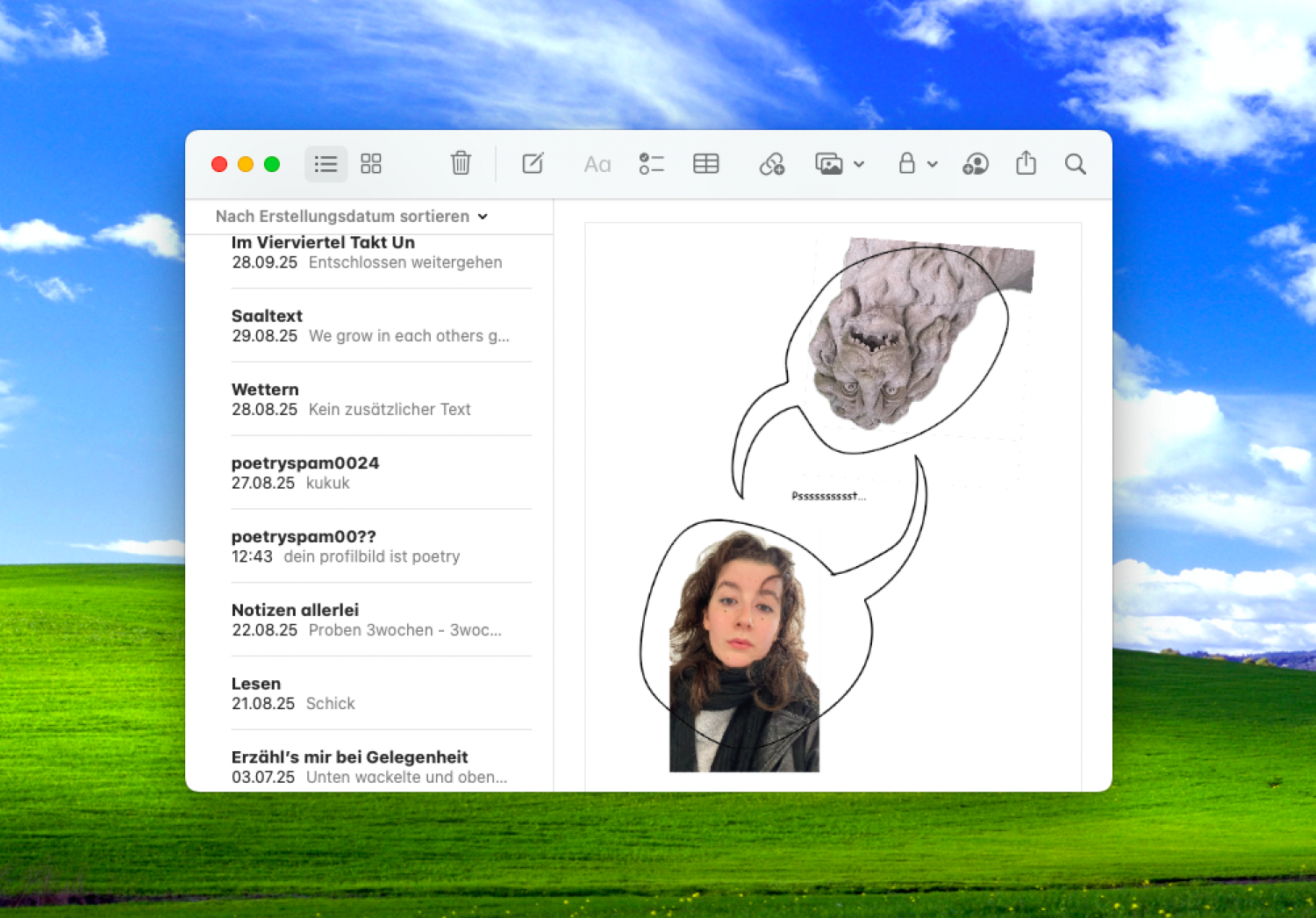 Aline Iris Schüpbach (*2000 in Biel/Bienne) beschäftigt sich in ihrem Atelier mit dem Erzählen – mit Text, Performance, Skulpturen und installativen Setzungen. Sie interessiert sich fürs Erinnern und Vergessen, für das Internet, für Ordnungssysteme, für vermeintliche NPCs, für Hunde und Freundschaften. Sie schreibt allein und in zwei Kollektiven. Aline hat einen BA in Kunst++Vermittlung, ist ausgebildete Sprecherin und liebt es, als Dramaturgin zu arbeiten.
