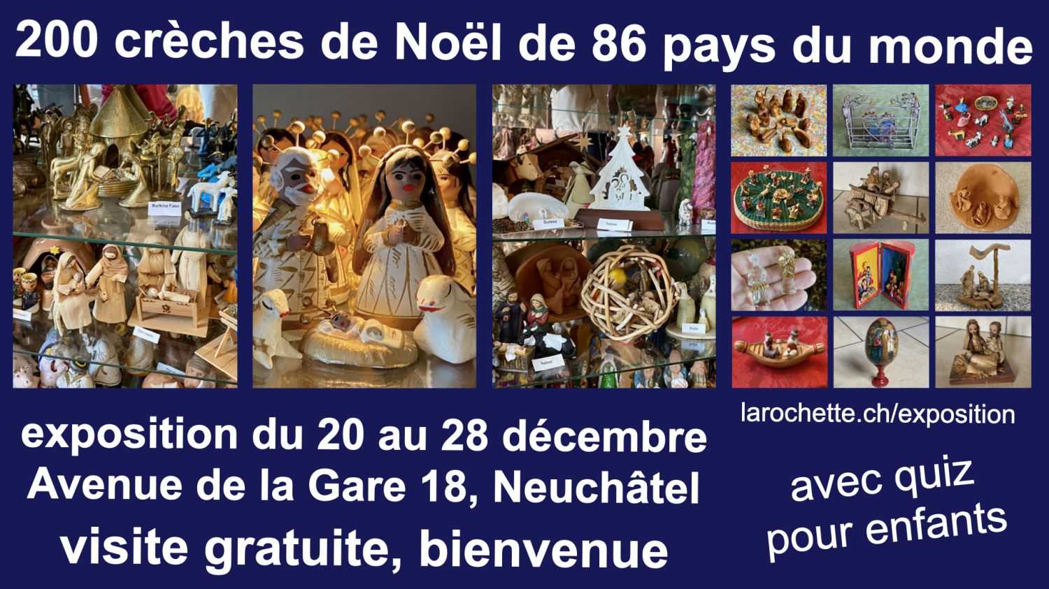Exposition de plus de 200 crèches provenant de plus de 86 pays du monde. Présentation par continents sur 2 étages, avec, pour les plus grandes crèches, disposition sous un très grand sapin de Noël.