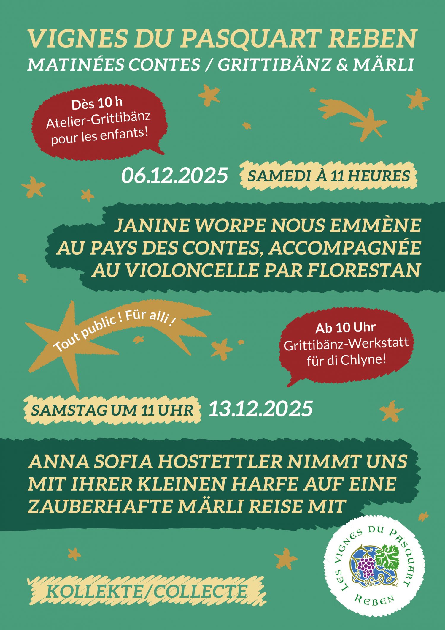 - Samstag 6.12. erzählt Janine Worpe Märli auf Französisch. Sie wird musikalisch von Florestan mit seinem Cello begleitet.