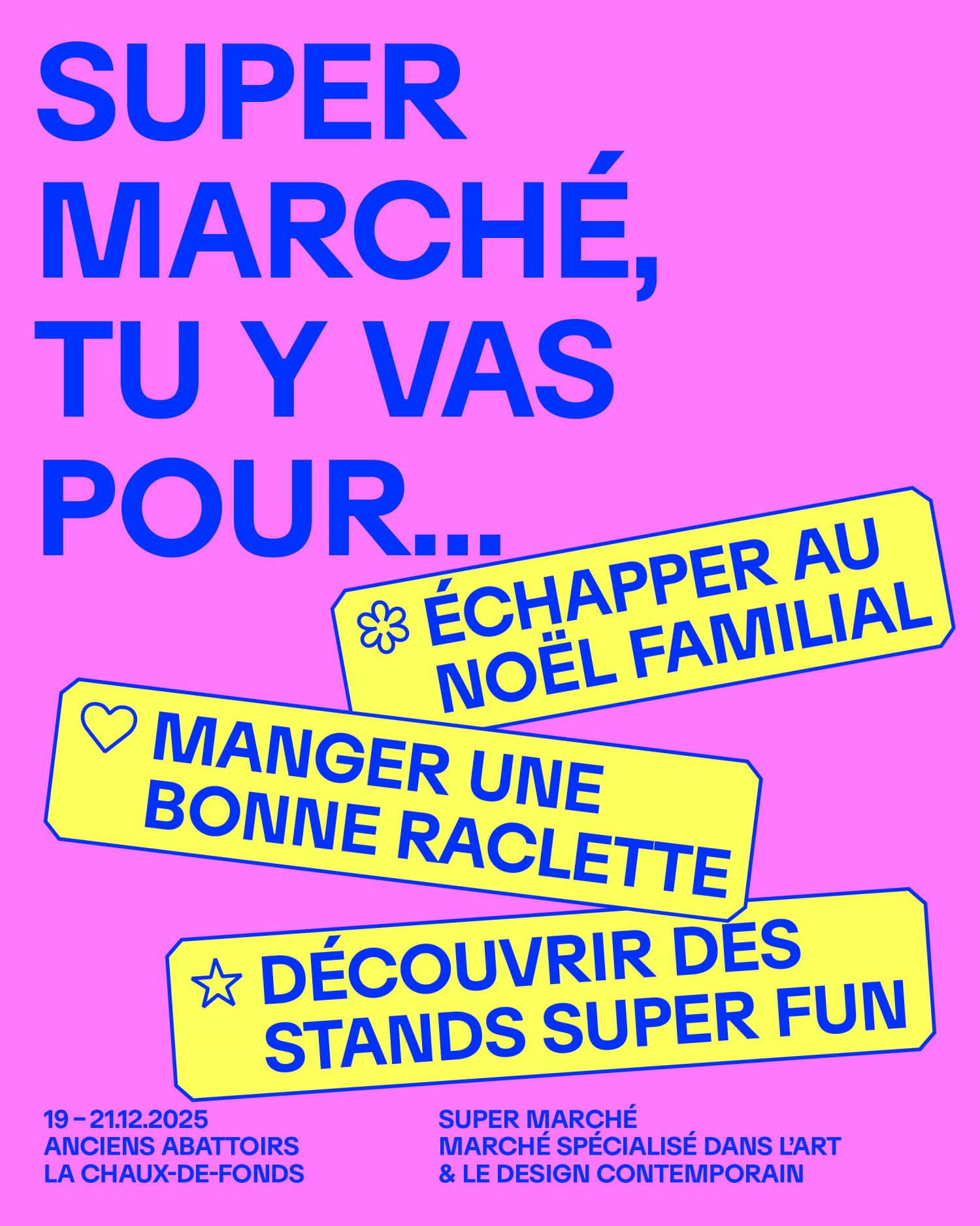 Super Marché est un pop-up store spécialisé dans le design et l’art contemporain. Organisé par Quartier Général – centre d’art contemporain de La Chaux-de-Fonds, il est reconnu par la Neue Zürcher Zeitung (2018) et par le Blick (2021) comme l’un des meilleurs marché de Noël de Suisse. Sur 3 jours, il propose un espace de vente commun à des artistes et designer·euses ainsi que des workshops, des DJ sets et un restaurant dans le bâtiment historique des Anciens Abattoirs de La Chaux-de-Fonds.