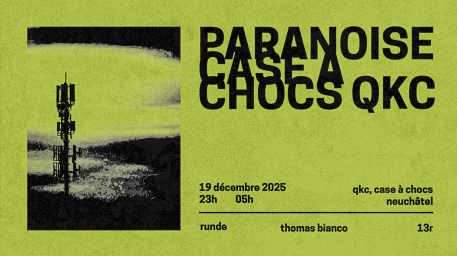 Le collectif PARANOISE est de retour au QKC pour son rendez-vous hivernal annuel et pour accueillir pour la première fois un live modulaire par l’artiste biennois Runde, qui jouera avec finesse avec la profondeur des sonorités que ses instruments produisent. Le collectif accueillera également le très méticuleux Thomas Bianco et son approche éclectique de la musique électronique, en remontant aux origines de la house ou en explorant les confins de la techno hypnotique. Runde et Thomas seront accompagnés de 13R, résident et cofondateur du collectif.