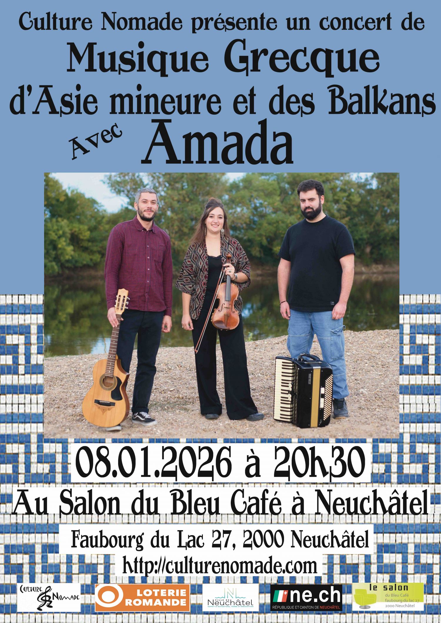 Tantôt festives ou mélancoliques, polyphoniques ou instrumentales, les musiques interprétées par le trio nous rappellent l’époque des Kafé Aman. Chansons d'amour, d'ivresse et d'exil, Amada explore les méandres de l'âme humaine et nous emporte au-delà des frontières qui nous sont familières...