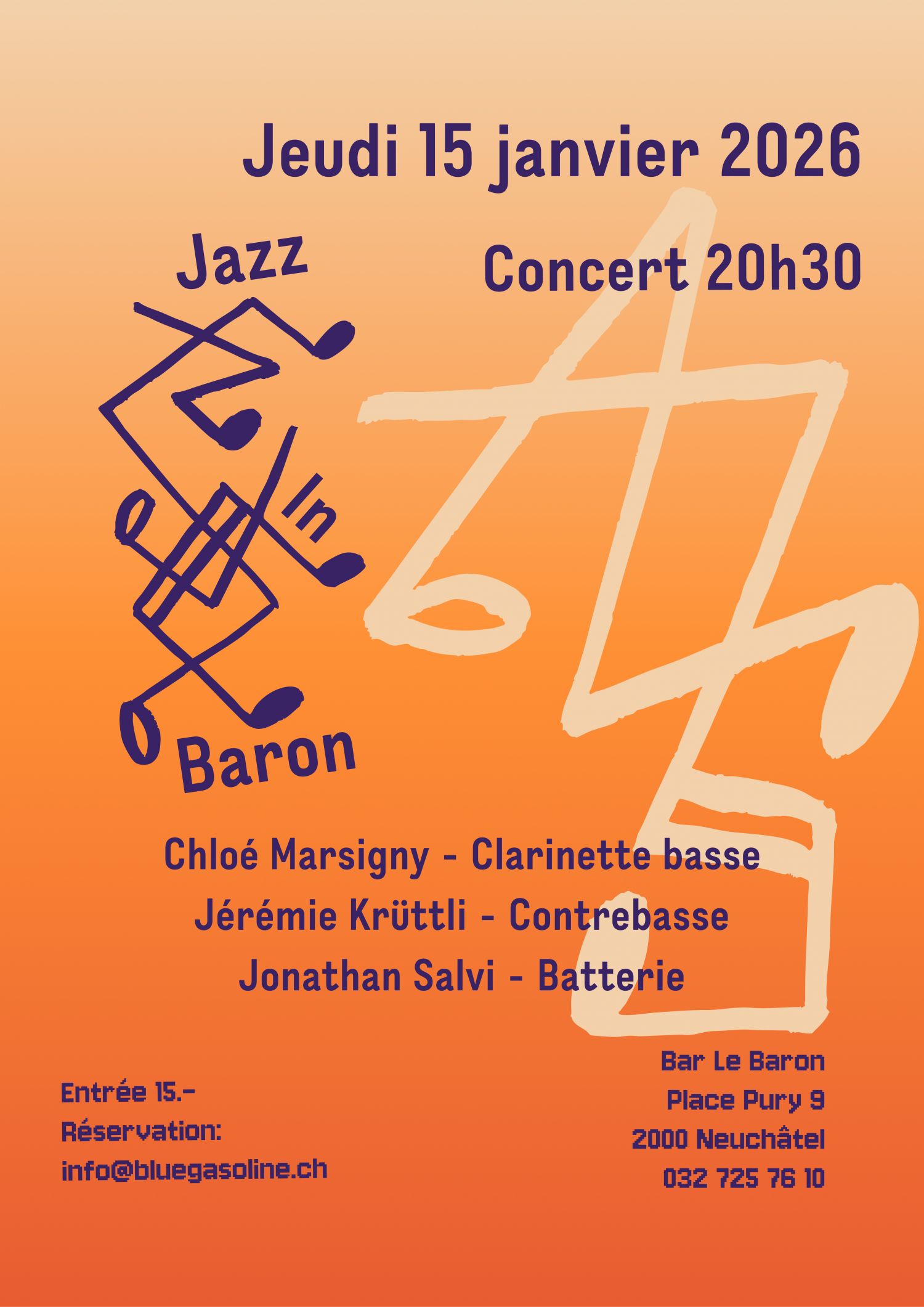 Une première soirée dans l’écrin feutré et accueillant du Bar Le Baron pour cette année 2026 avec une formation pour le moins étonnante, mais pleine de promesse. Un trio sans harmonie, mais plein de mélodie avec à la clarinette basse, Chloé Marsigny, figure du jazz actuel suisse, accompagnée d’une section rythmique habitué des lieux.