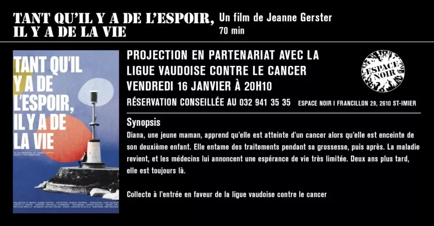 Vendredi prochain, le 16 janvier à 20h10, le cinéma d'espace noir vous propose un documentaire en collaboration avec la Ligue vaudoise contre le cancer