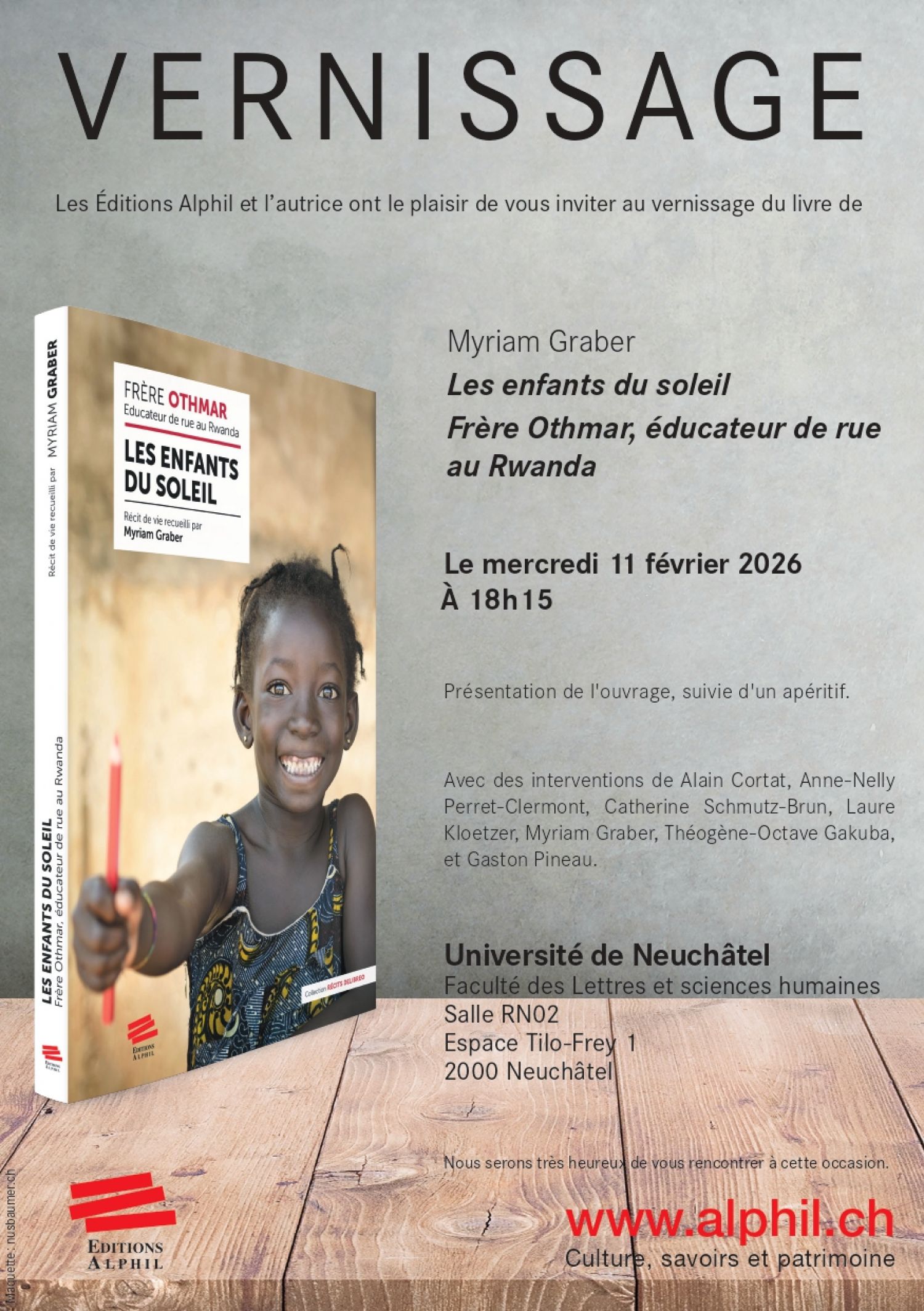 Les Éditions Alphil et l’autrice ont le plaisir de vous inviter au vernissage du livre de Myriam Graber, Les enfants du soleil. Frère Othmar, éducateur de rue au Rwanda, le mercredi 11 février à 18h15, à l'Université de Neuchâtel (Salle RN02, Espace Tilo-Frey 1). Programme :