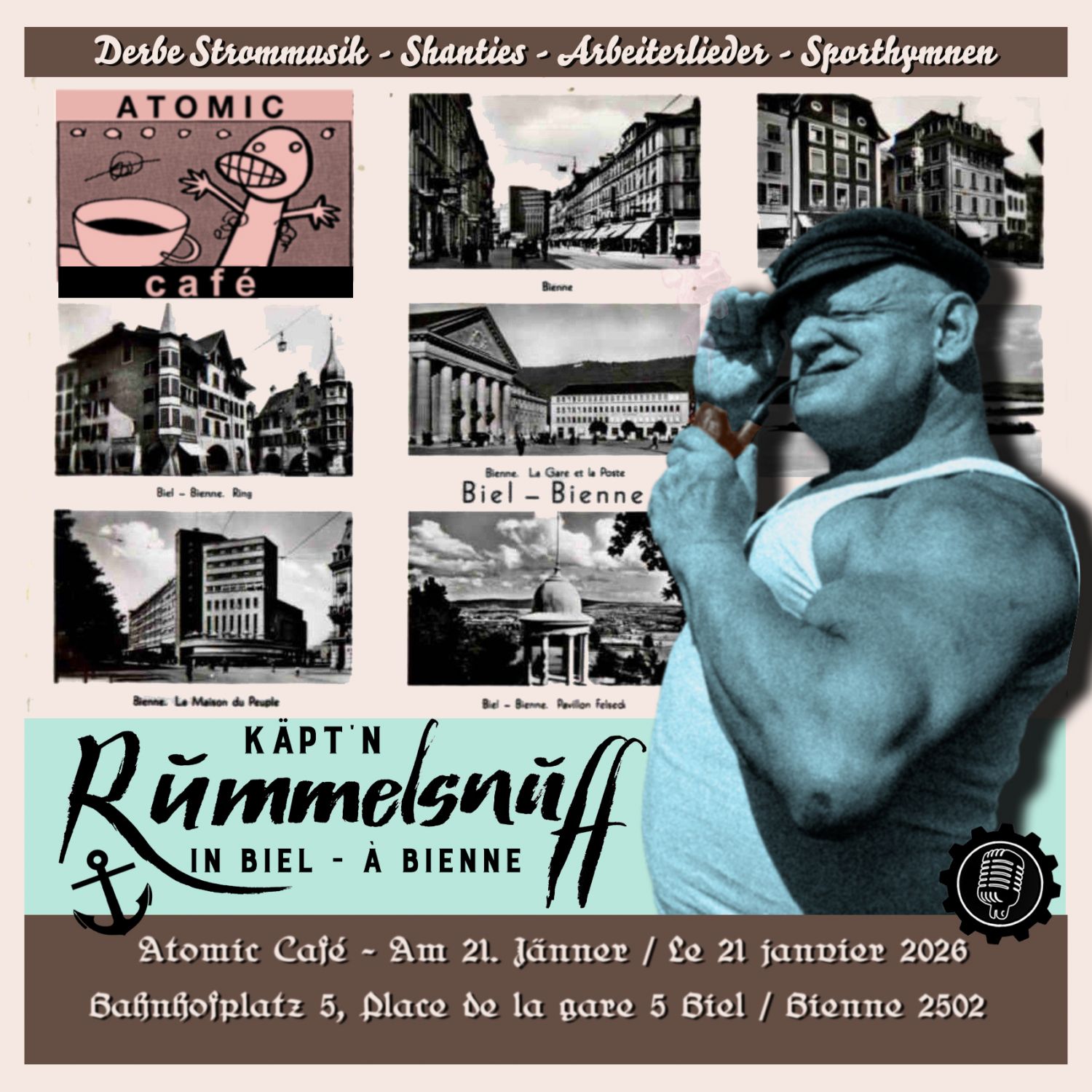 Le capitaine Rummelsnuff en Suisse - ça peut arriver. Mais en 2026, pour la première fois, le capitaine débarquera à Bienne et apportera avec lui une brise salée et une musique électro brute. Rummelsnuff est aussi vieux que la mer et vient de l'est de l'Allemagne, plus précisément de la RDA. Mais il a déjà sillonné toutes les eaux d'Europe, et pas seulement celles-ci... À Bienne, le capitaine présente son programme solo, et celui-ci a tout pour plaire. Vous danserez sur de la musique électronique devant et sur la scène et vous vous enlaceriez en chantant ses chansons de marins émouvantes. Le capitaine apporte des poids en fer pour lui-même et son cher public et parle de musculation. Ou des échafaudeurs. Puis il se remémore un pays d'avant votre époque, chères filles et chers garçons. Venez maintenant faire un bras de fer sur scène, le capitaine désignera lui-même le gagnant et la gagnante – ou venez simplement profiter du spectacle.