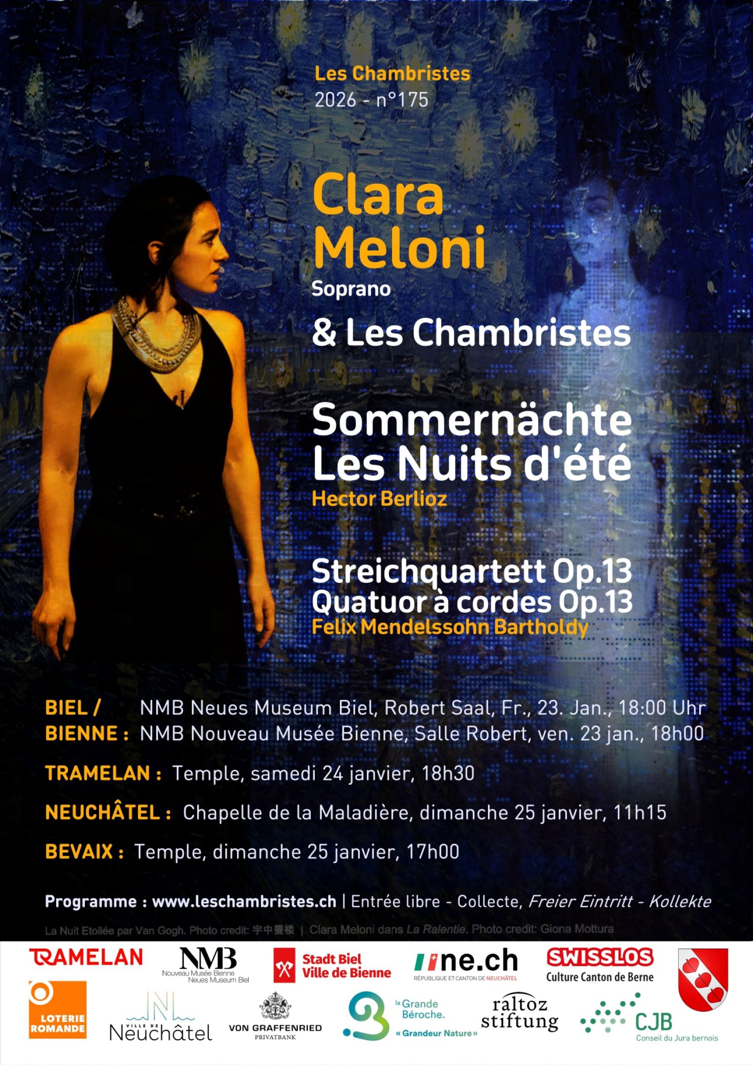 Pour leur prochain programme, Les Chambristes invitent la soprano Clara Meloni. Ils interpréteront deux compositions emblématiques du Romantisme, un bouillonnant quatuor de Felix Mendelssohnet les célèbres Nuits d’été d’Hector Berlioz, composées sur des poèmes de Théophile Gautier.
