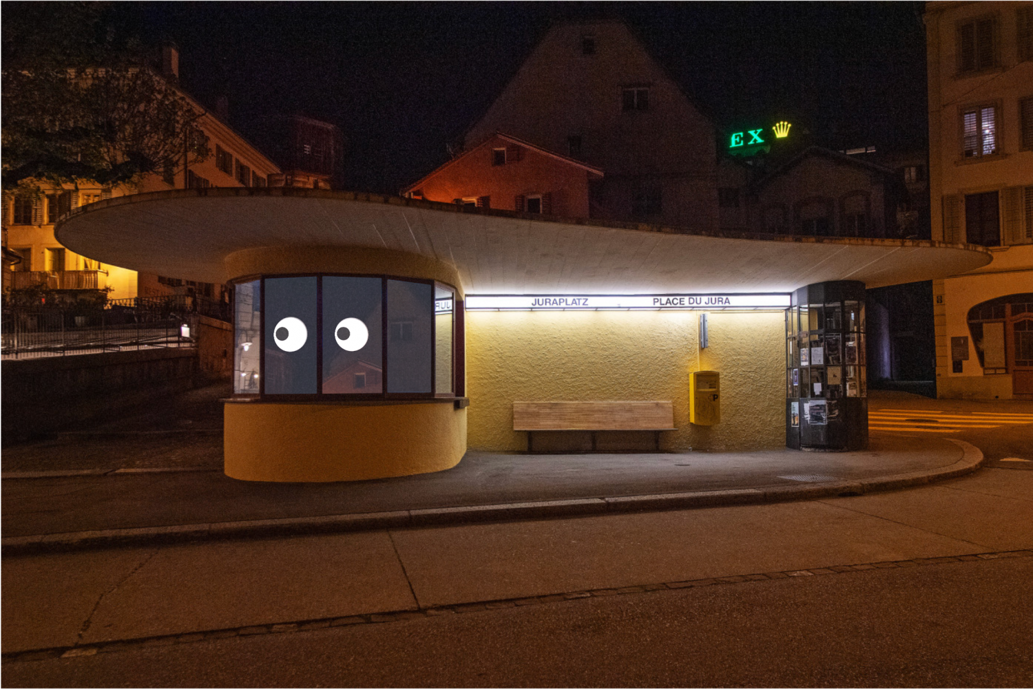 Ab dem 23. Januar '26 bekommt der Juraplatz ein Gesicht oder besser gesagt: zwei riesige Augen, die aus den Fenstern des Pavillons schauen. Und die schauen nicht einfach nur: Sie verfolgen dich. Sie blinzeln. Sie werden müde oder neugierig. Sie reagieren auf jeden, der vorbeikommt.