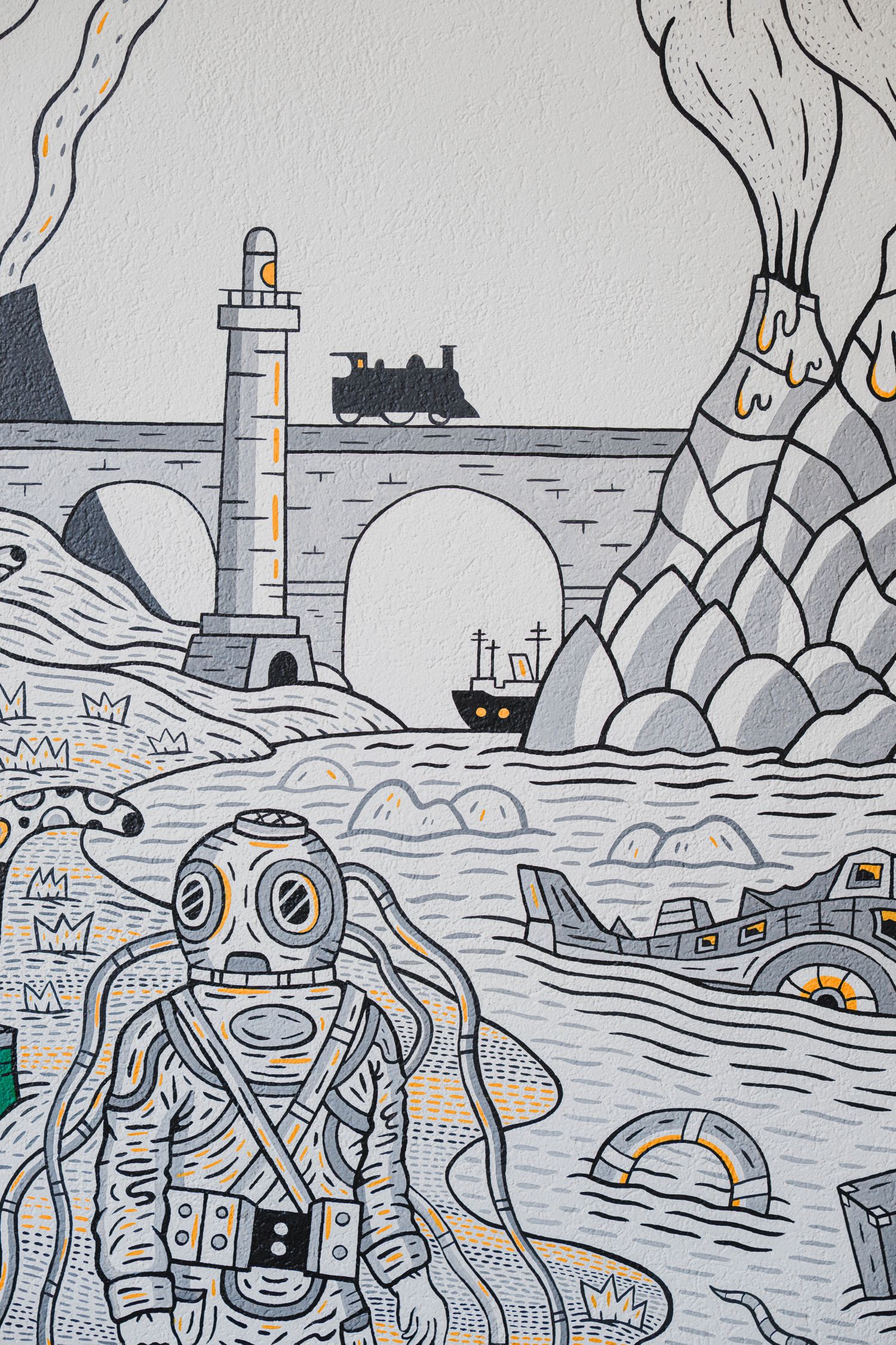 Sélection d'illustrations issues des carnets de route d'Yves Hänggi, entre réel et imaginaire, en écho à la peinture murale La malle verte réalisée dans l'hôtel par l'artiste