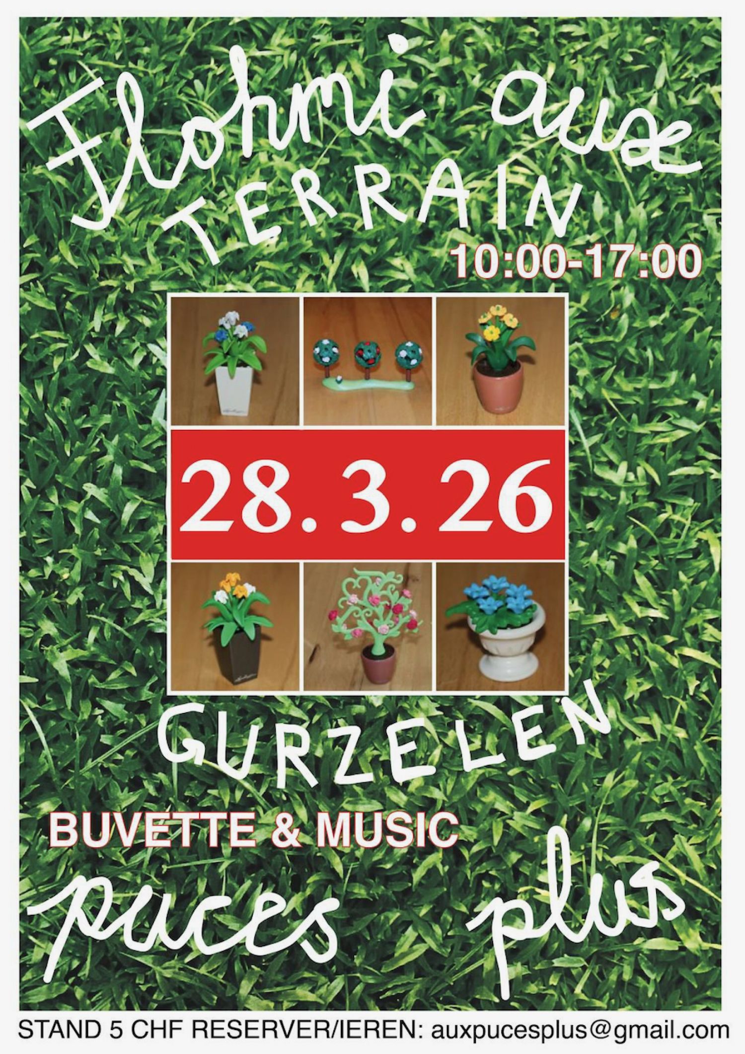Printempsflohmarkt sur le terrain Guerzelen. Platz reservieren: auxpucesplus@gmail.com - Standgebühr CHF 5.-