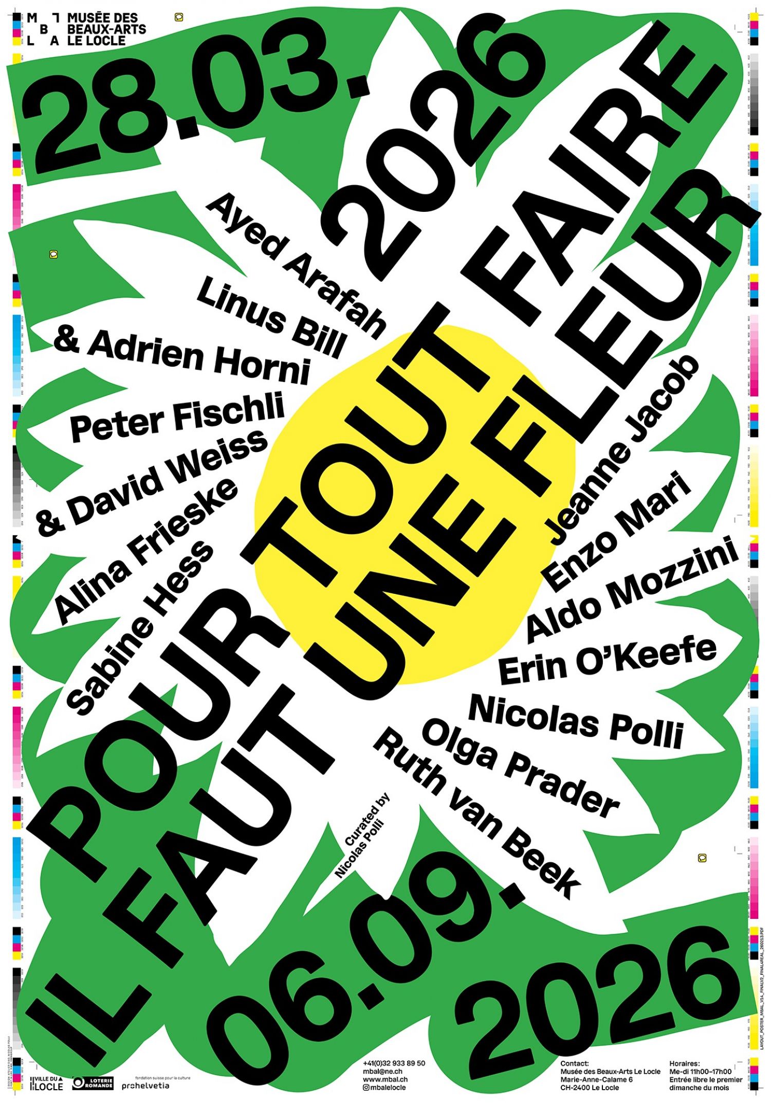 Le MBAL se réjouit d’accueillir, pour le cycle du printemps 2026, l’exposition Pour tout faire, il faut une fleur. Le projet, porté par l’artiste, graphiste et enseignant suisse Nicolas Polli, propose une réflexion inédite sur les croisements entre photographie, design graphique et pratiques artistiques hybrides. L’exposition réunit une constellation de créateur·rice·x·s suisses et internationaux·ales, issu·e·x·s de disciplines variées et rassemblé·e·x·s par une volonté commune de brouiller les frontières traditionnelles entre les champs artistiques.