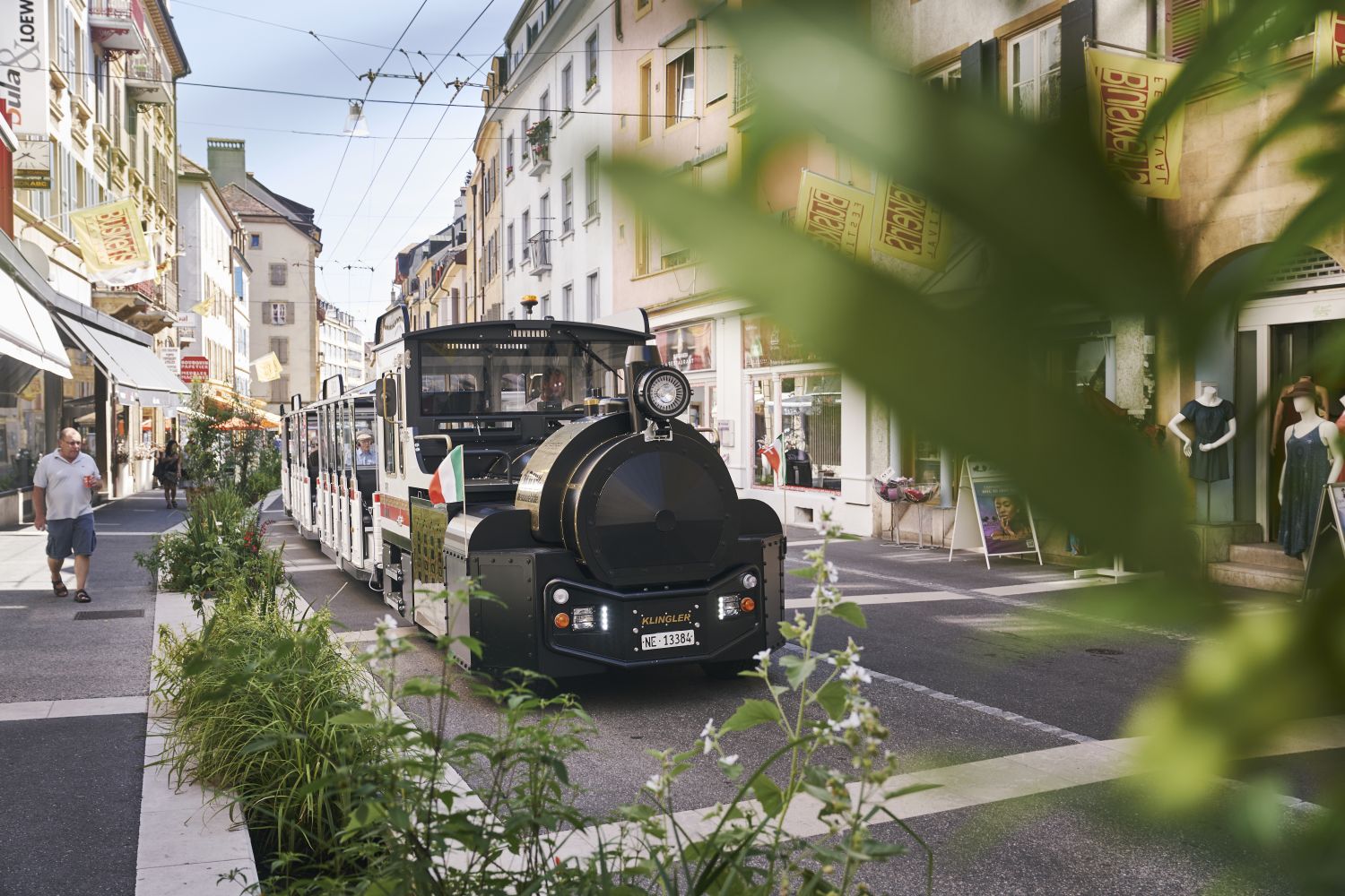 Le premier e-train de Suisse emmène ses visiteurs à la découverte des charmes de la cité millénaire. Grâce à son toit vitré, une vue panoramique s'ouvre sur ses rues piétonnes, ses édifices historiques en pierre jaune, son Château et sa Collégiale. Train électrique avec une locomotive unique au monde et un toit panoramique.