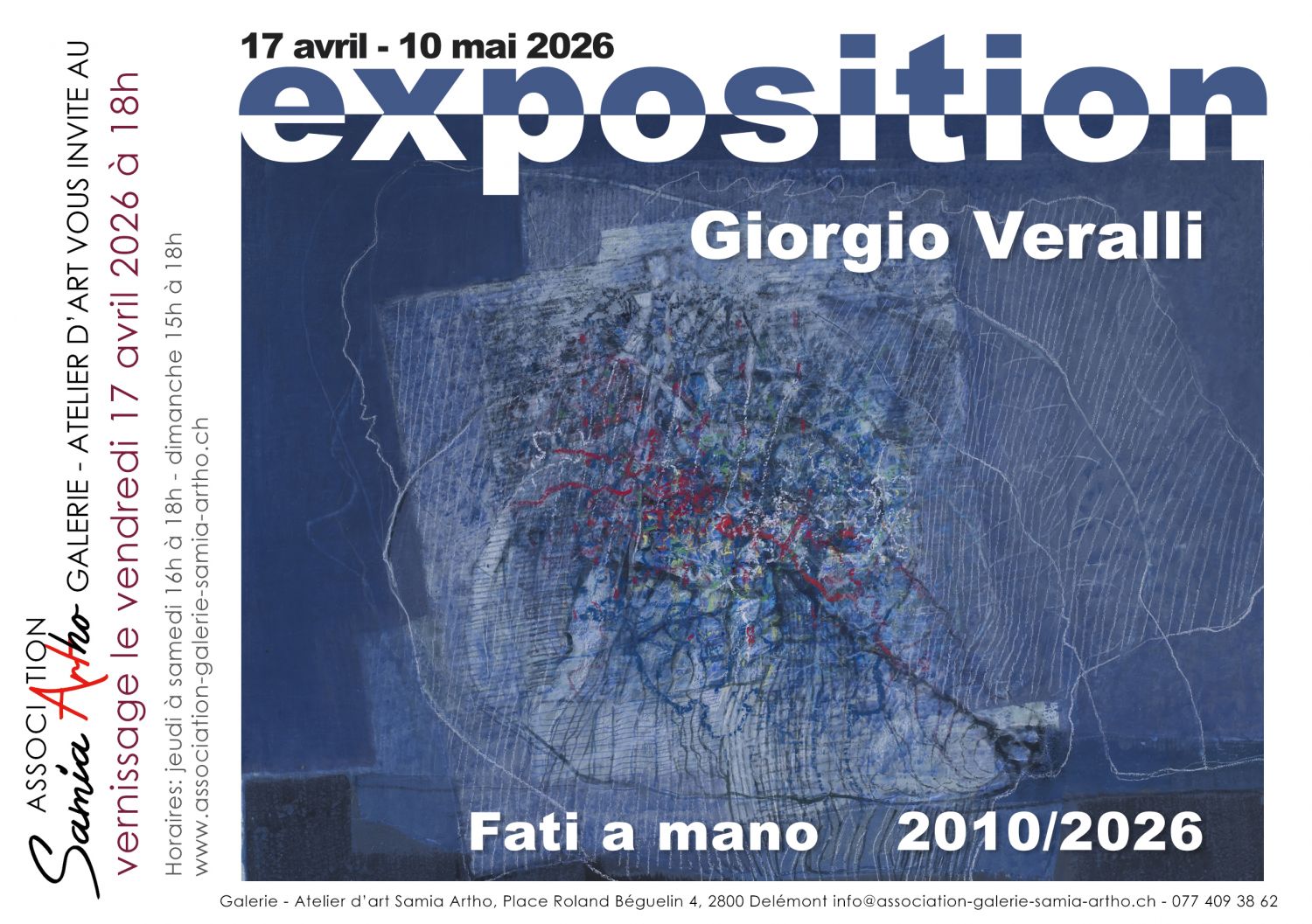 Vernissage le 17 avril à 18h00 de l'exposition "Fatti a mano" de l'artiste Giorgio Veralli, des oeuvres de 2016 à 2026. Né en Italie et installé dans le Jura depuis presque toujours, Giorgio Veralli développe une œuvre profondément libre, nourrie par l’expérience, l’intuition et le dialogue constant avec la matière. Souligner l’importance du geste de la main, cette énergie première qui vient habiter la toile et fait vibrer les couleurs. Ses tableaux naissent souvent sans esquisse préalable, laissant émerger formes et rythmes au fil du travail. Couleurs, textures et mouvements s’entrelacent, donnant naissance à des compositions où se mêlent abstraction et résonances intérieures. Chaque toile devient ainsi un espace de recherche, une trace sensible d’un moment vécu.Dans cette approche instinctive, la peinture devient un véritable langage. Elle ne cherche pas à représenter, mais à suggérer, à faire ressentir. Les formes apparaissent, se transforment, se répondent, créant des équilibres subtils entre tension et harmonie. L’ensemble de son œuvre invite à un voyage intime, entre matière et émotion, où se dessinent des paysages intérieurs en perpétuel mouvement.