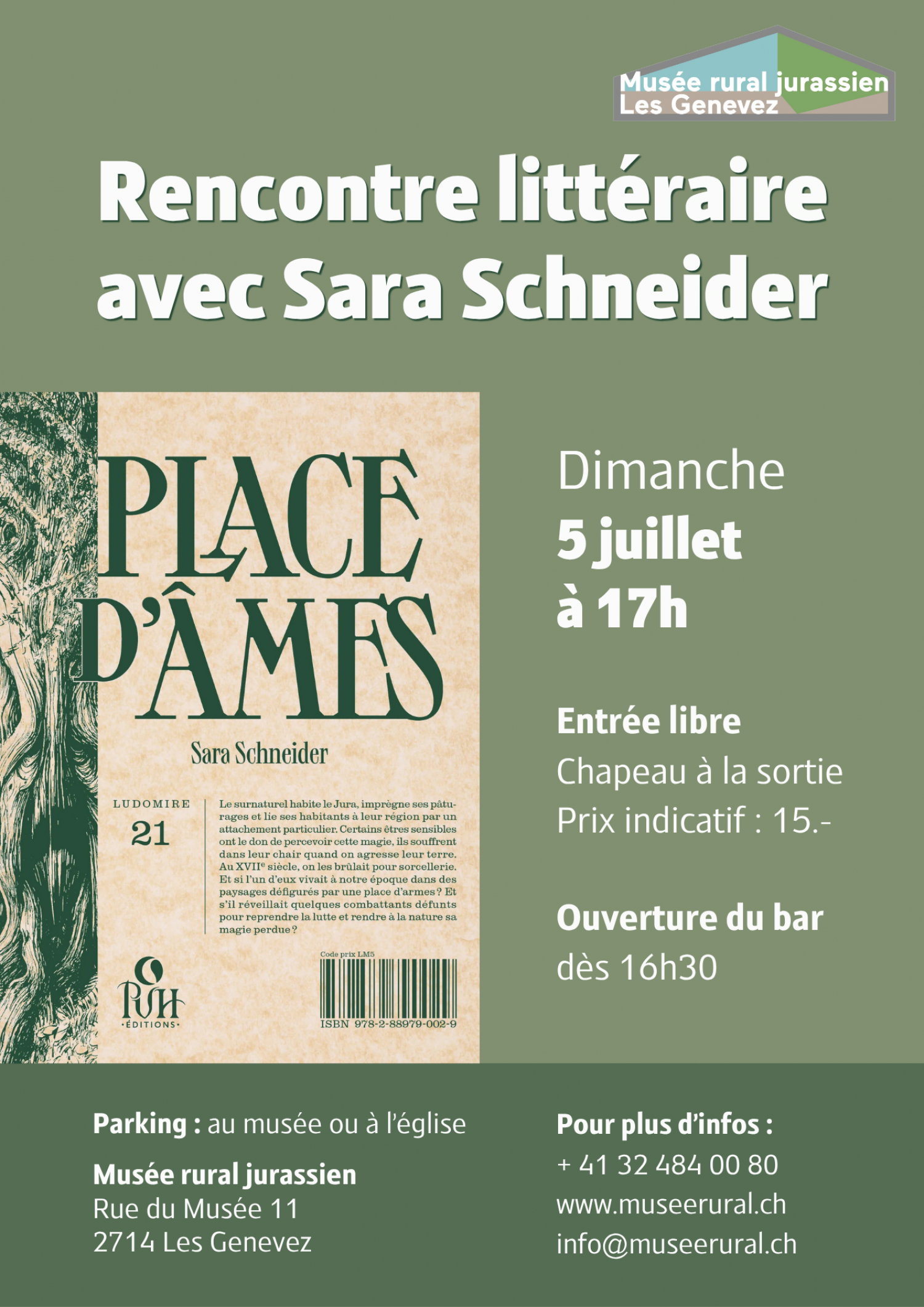 Rencontre littéraire avec Sara Schneider : Le dimanche 5 juillet 2026 à 17h00, le Musée rural jurassien accueille une rencontre avec l’écrivaine Sara Schneider autour de son roman « Place d’âmes ».