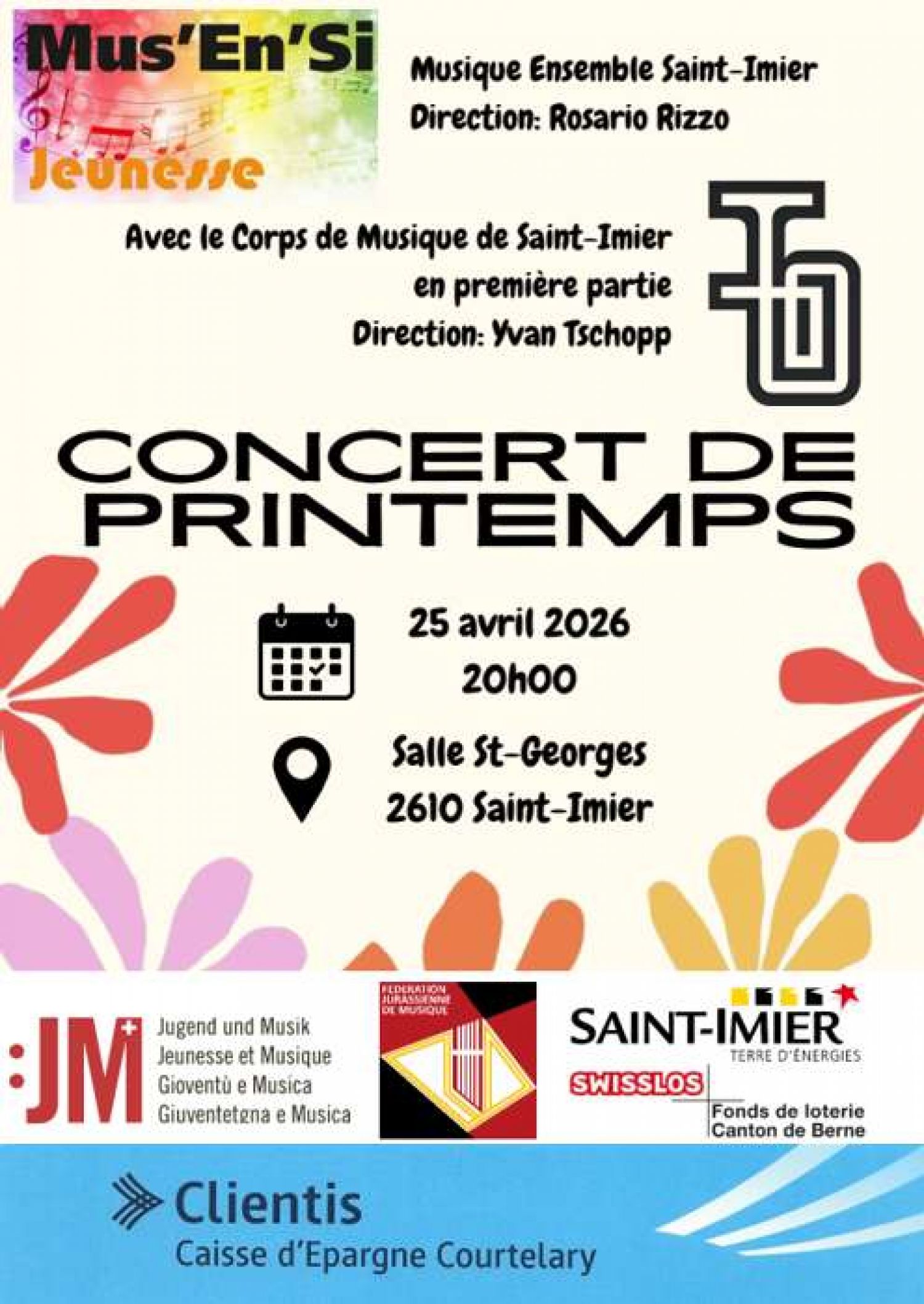 Les jeunes musiciens de Mus’En’Si organisent leur Concert de Printemps et vous donnent rendez-vous le samedi 25 avril 2026 à 20h à la salle St-Georges à Saint-Imier.