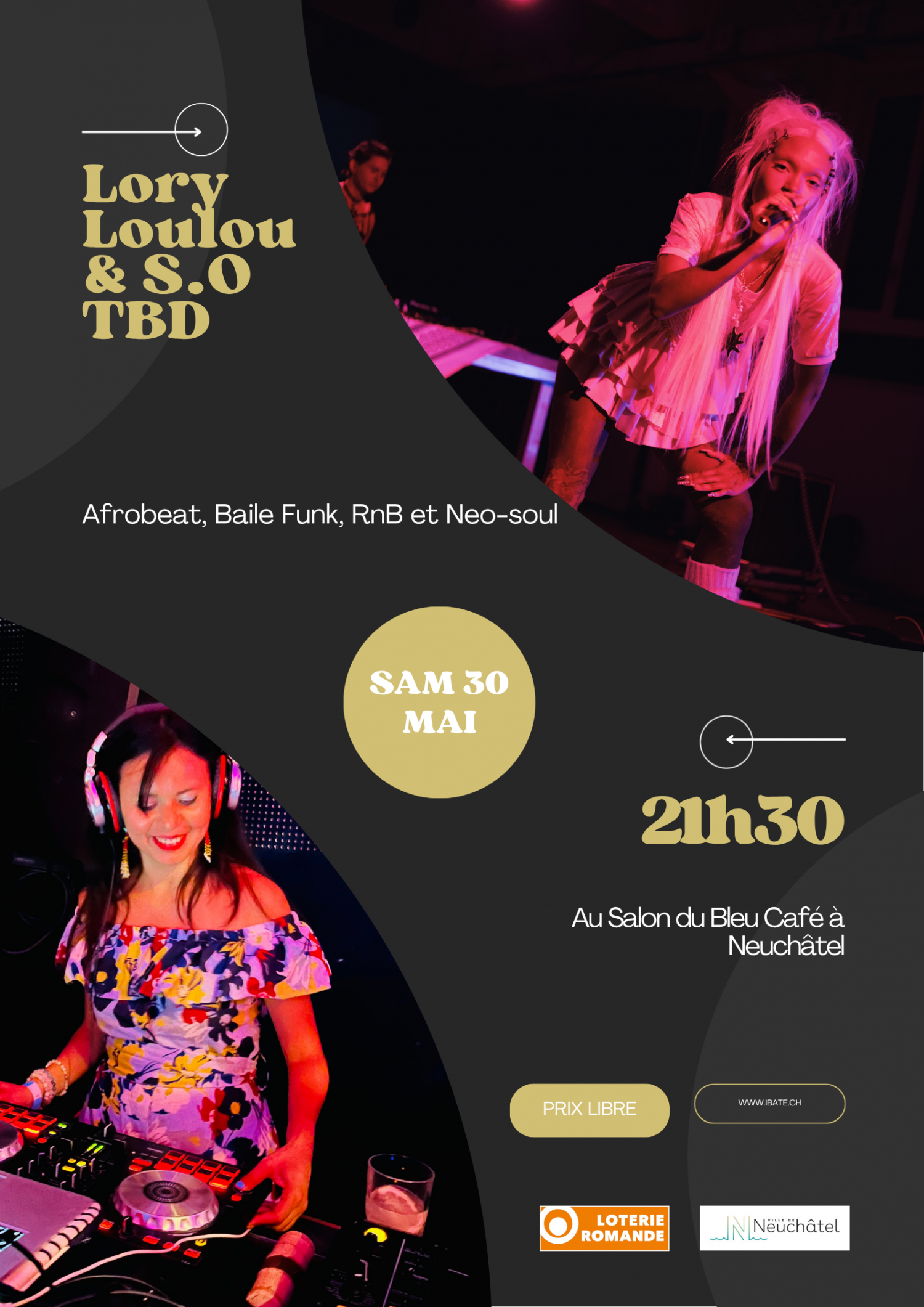 S.O The Baddest Dame, alias S.O TBD, est une chanteuse, auteure-compositrice et interprète basée à Genève.De nationalité portugaise et originaire du Cap-Vert, d'Angola, du Brésil et du Japon.Baignée dès son plus jeune âge dans un environnement artistique familial, elle a très tôt développé une passion pour la musique et la scène.Après plusieurs projets collectifs, dont le groupe « OWO ORKESTRA », elle a décidé de tracer sa propre voie.Elle dévoile un projet solo vibrant qui fusionne Afrobeat, Baile Funk, RnB et Neo-soul.Sur scène, S.O déploie une énergie captivante, entre puissance, sensualité et libertéDJ Lory Loulou, originaire du Brésil, fait vibrer les pistes depuis 2012 avec une signature musicale solaire et envoûtante. Spécialisée dans les rythmes tropicaux, elle transporte son public dans un voyage entre chaleur, énergie et sensualité.Pour cette soirée, elle vous prépare un set explosif mêlant baile funk et afro beats — une fusion irrésistible qui promet de faire monter la température et de vous garder sur le dancefloor toute la nuit.Horaires : 21:30