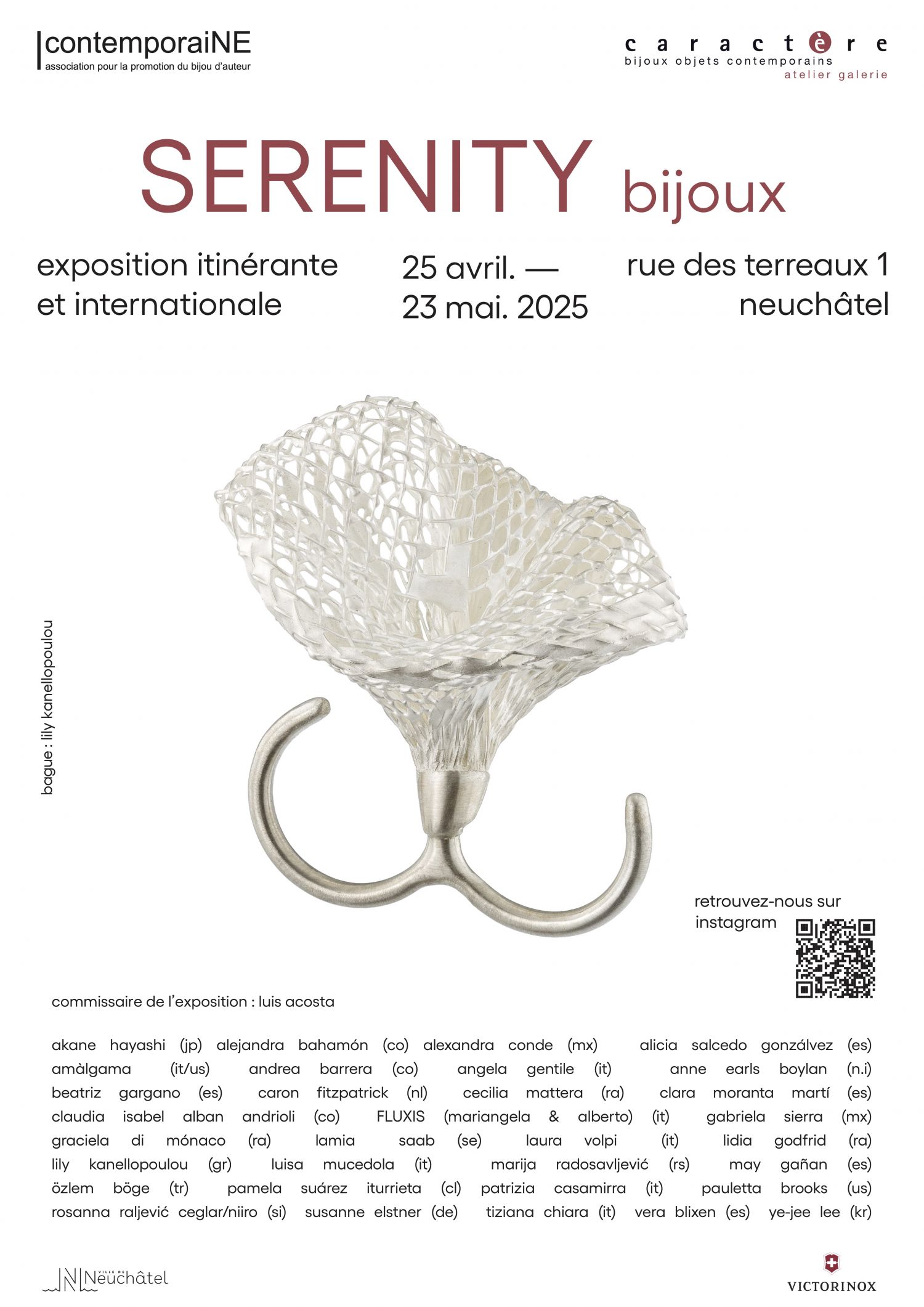 “SERENITY bijoux” exposition collective, internationale et itinérante de bijoux contemporains organisée par le commissaire d’exposition Luis Acosta qui sera inaugurée le samedi 25 avril de 10h00 à 17h00 à la galerie caractère.
