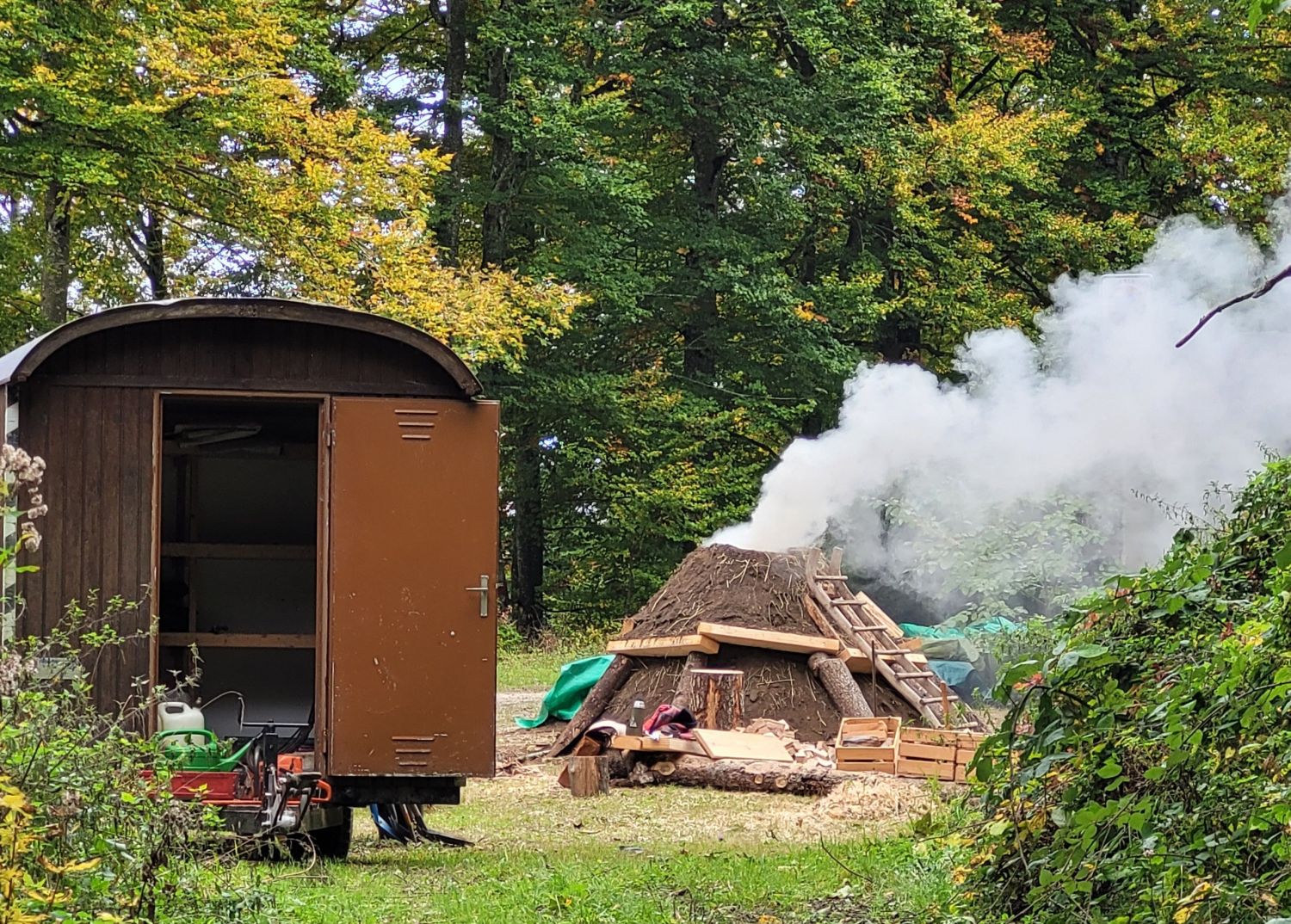 À l'arrivée, un lieu chargé d'histoire vous attend : la meule, gardée par un tilleul remarquable, et Laure Oberli, charbonnière. Un plongeon dans le quotidien des charbonniers — ces hommes et ces femmes qui vivaient des semaines entières en forêt pour alimenter les industries métallurgiques de la région. Grâce à une animation vivante et participative (spécialement adaptée aux enfants) autour de la meule, vous comprendrez le principe de carbonisation du bois en milieu étouffé, les essences soigneusement sélectionnées, l'habitat temporaire du charbonnier, et le rôle économique et historique crucial que jouait le charbon de bois dans le Jura.