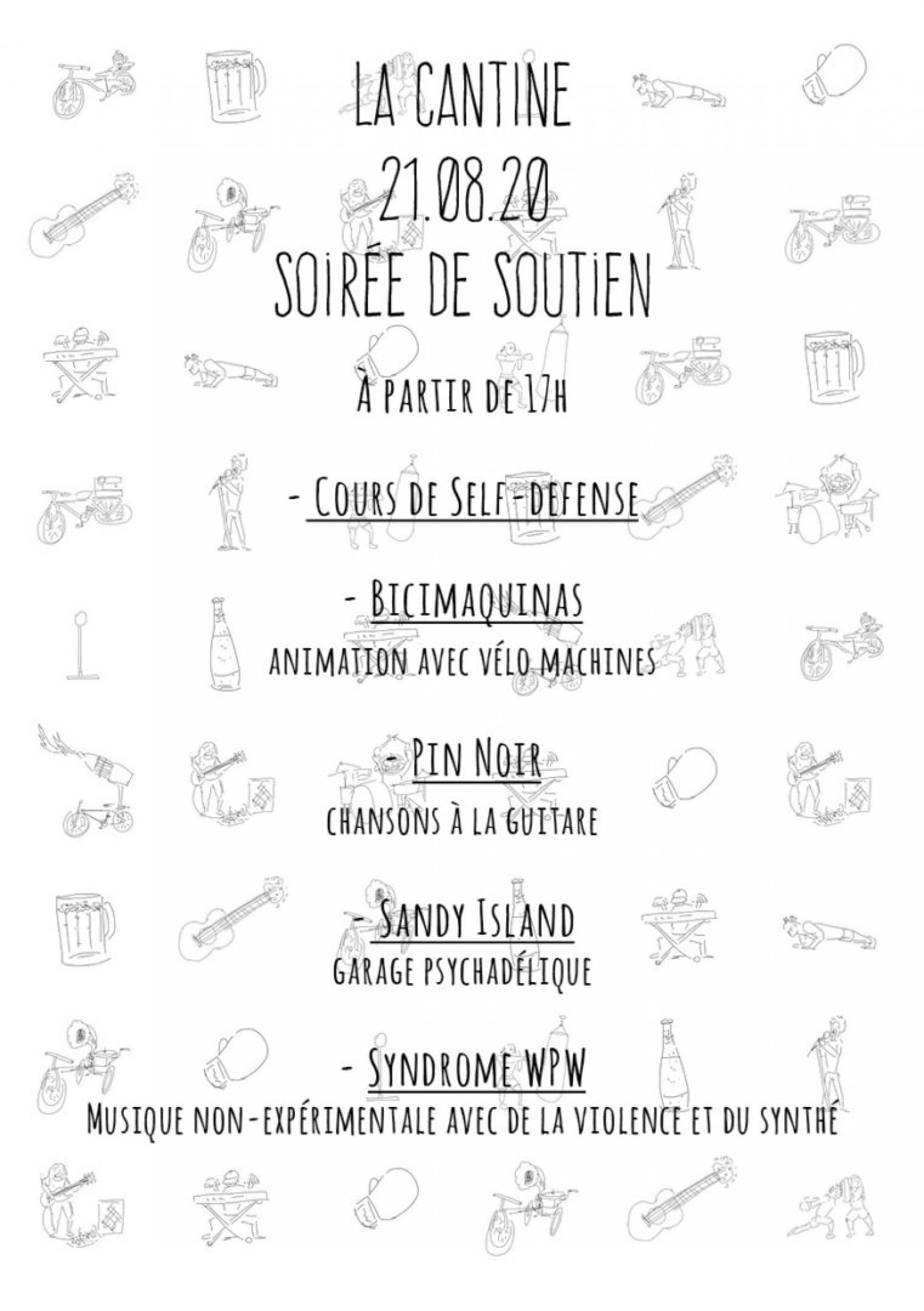 La Cantine vous souhaite la bienvenue à sa soirée de soutien. Elle commencera dès 17h30 pour un petit cours participatif de self-défense, puis une animation de vélo machine prendra place dans la grande salle.3 concerts suivront pour te décoiffer façon bigoudi crescendo. 1er concert : Pin Noir (chanson à la guitare) 2ème concert : Sandy Island (garage psychédélique) 2ème concert : Syndrome WPW (musique non expérimental avec de la violence et du synthé)