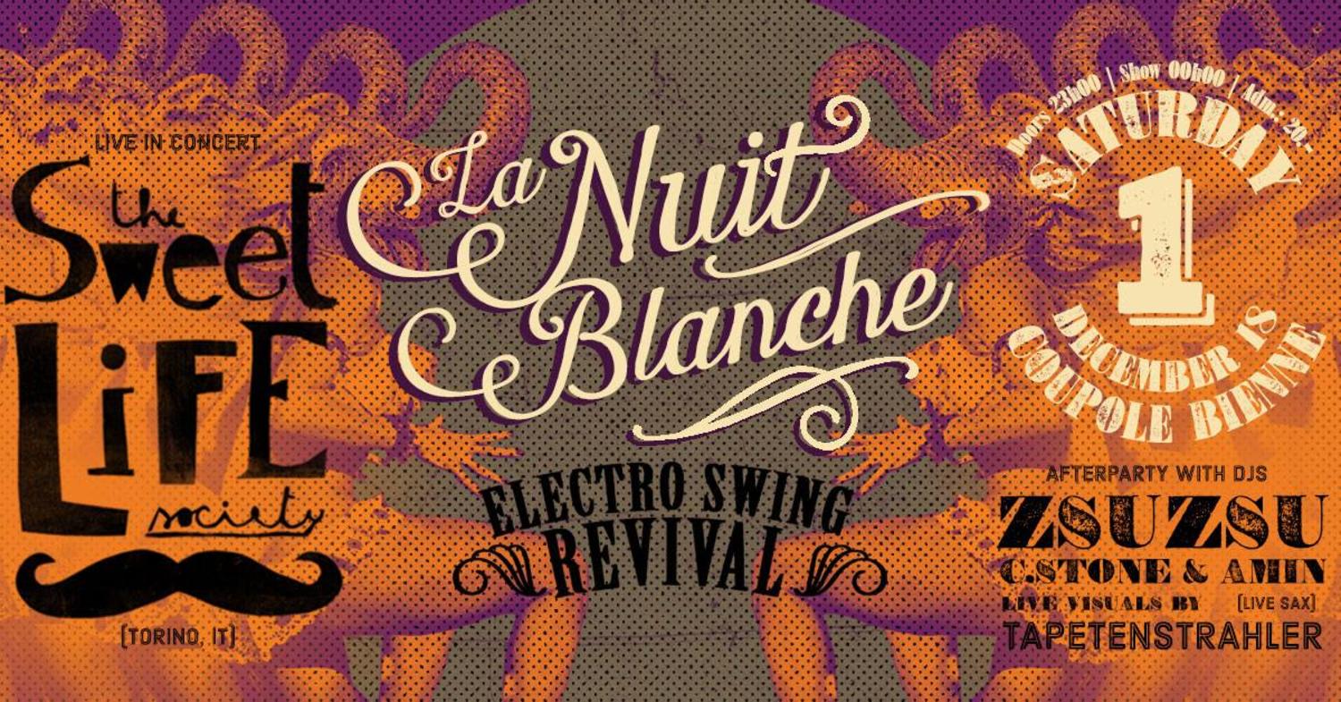 LA NUIT BLANCHE IS BACK - Nach 2 Jahren kehrt die legendäre Electro-Swing-Reihe am 1. Dezember mit einer Revival-Ausgabe zurück. Fulminant wie eh und je, mit viel Tam Tam, Konfetti und Swing. Als besonderes Live-Special wird THE SWEET LIFE SOCIETY in fünfköpfiger Formation die Nacht musikalisch eröffnen. Die beiden Produzenten aus Turin sind feste Grössen in der Electro-Swing-Szene und touren seit 2014 mit einigen der besten Jazz-Musikern Norditaliens um die Welt. Erst diesen Frühling veröffentlichten sie ihr neues Album «Antique Beats», das Vintage-Sound mit neuem Groove und einer kraftvollen Mischung aus elektronischer Musik, Soul, Jazz, Hip Hop und Reggae präsentiert. Im Anschluss verpassen die Macher der Breakfast at Tiffany's Partyreihe der Nacht den richtigen Drive. Mit DJ ZsuZsu steht eine Ikone des Schweizer Electro-Swing hinter den Reglern. ZsuZsu lässt die Klänge der 50er Jahre auf die treibende Energie elektronischer Musik prallen. Dabei geben sich House, Deep House, Electro und Electro Swing die Klinke. Abgerundet wird die Nacht von DJ C.STONE und AMIN am Saxophon. Dress to impress - schöne Menschen machen Laune und können sich im Photo Shooting Corner ablichten lassen.