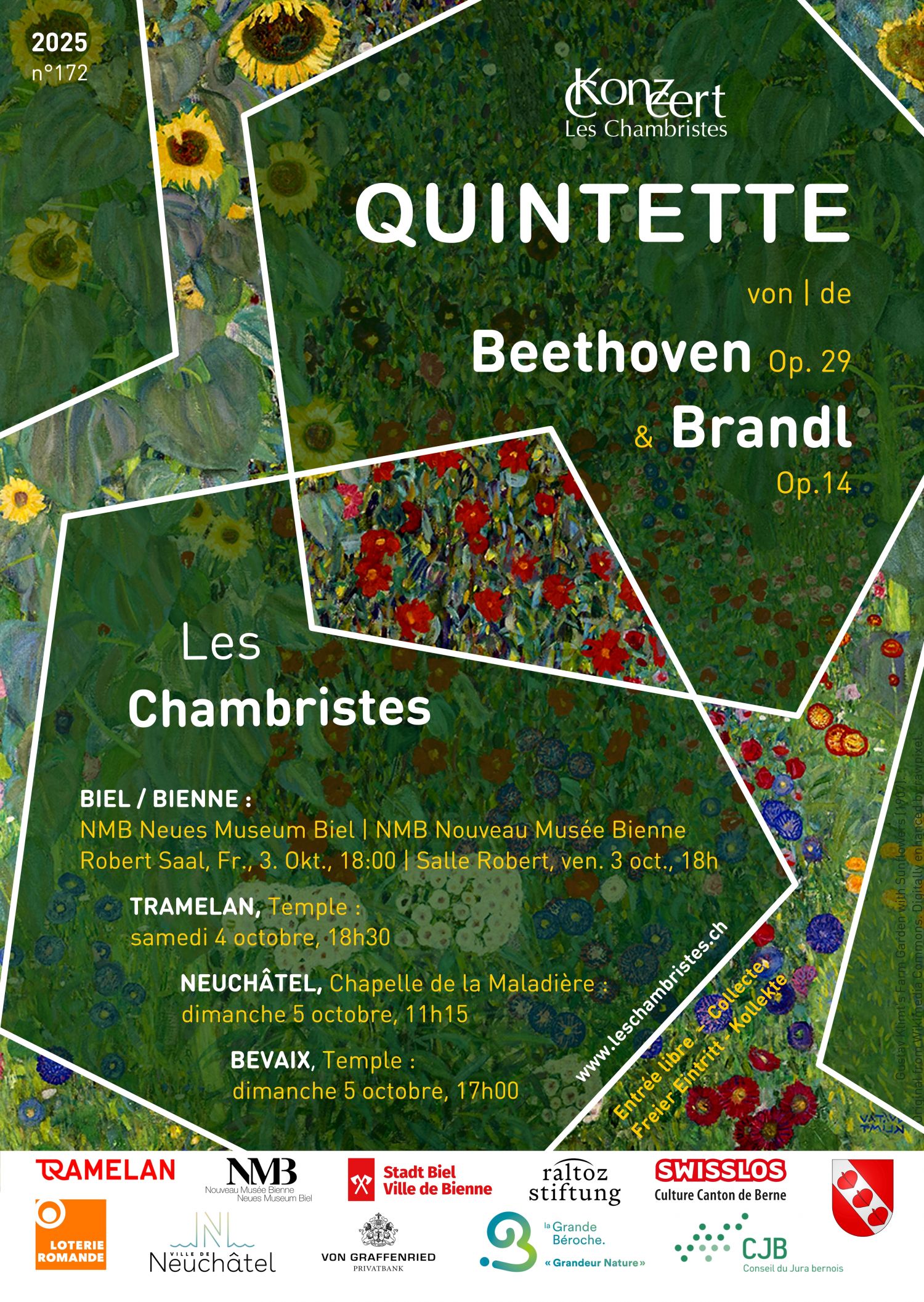 Les Chambristes interprètent le fougueux et orageux quintette à deux altos de Beethoven, un moment musical décoiffant ! De la même époque, un quintette plein de charme et d’esprit signé Johann Evangelist Brandl, un de ces compositeurs injustement oubliés. Les Chambristes veulent que leurs concerts soient accessibles à tous. C'est pourquoi l'entrée est libre (collecte). Les familles sont les bienvenues (durée : 1h environ)