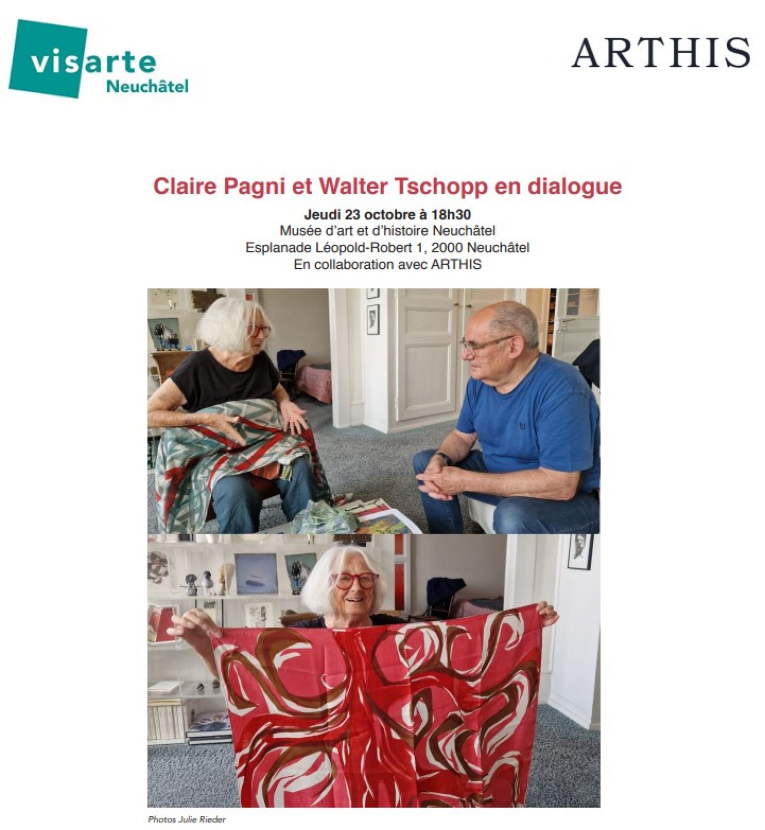 Le MahN accueille une soirée organisée par ARTHIS et Visarte Neuchâtel, réunissant l’artiste Claire Pagni et l’historien de l’art Walter Tschopp pour un dialogue autour de plus de soixante ans de création.
