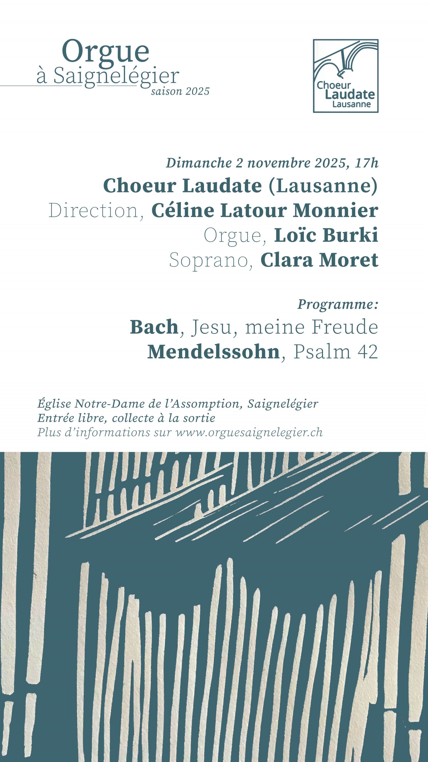 L'association Orgue à Saignelégier accueille le Choeur Laudate de Lausanne, placé sous la direction de Céline Monnier Latour. Accompagné à l'orgue par Loïc Burki et de Clara Moret, soprano, l'ensemble interprétera notamment le Motet "Jesu, meine Freude" de Bach et le célèbre Psaume 42 de Felix Mendelssohn.