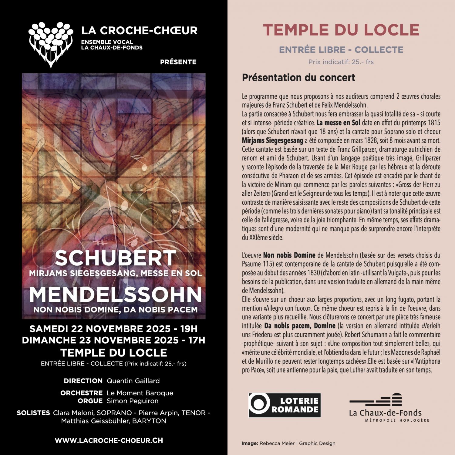 Le programme que nous proposons à nos auditeurs comprend 2 œuvres chorales majeures de Franz Schubert et de Felix Mendelssohn.