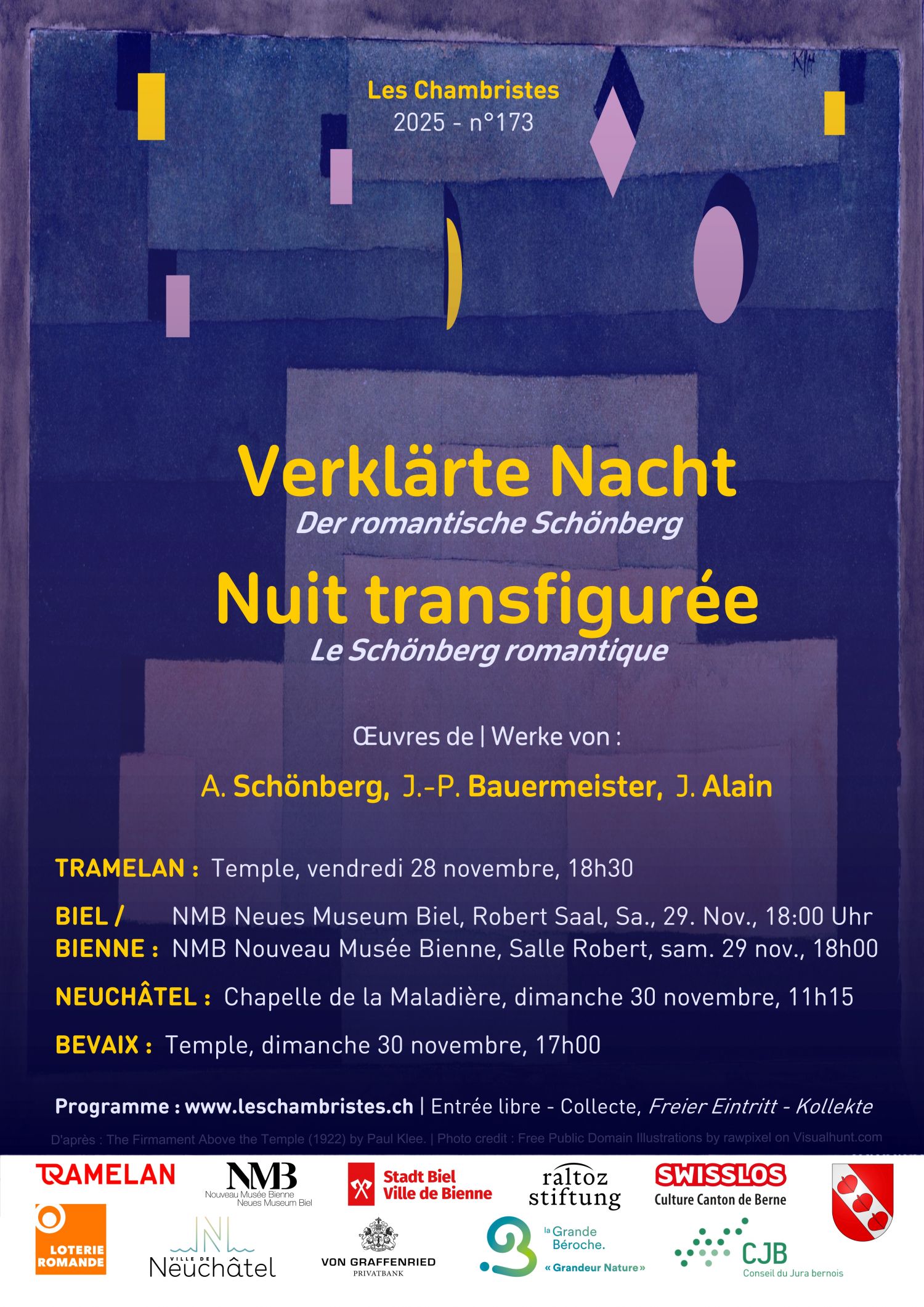 Une Petite Rumba des Alpes, deux danses dédiées au dieu hindou du feu... Après ces pièces signées Jean-Philippe Bauermeister et Jehan Alain, Les Chambristes proposeront deux visions bien différentes de la nuit. La Notte de Vivaldi entraîne des masques dans un monde de fantômes, La Nuit Transfigurée de Schönberg touche au paroxysme du post-romantisme.