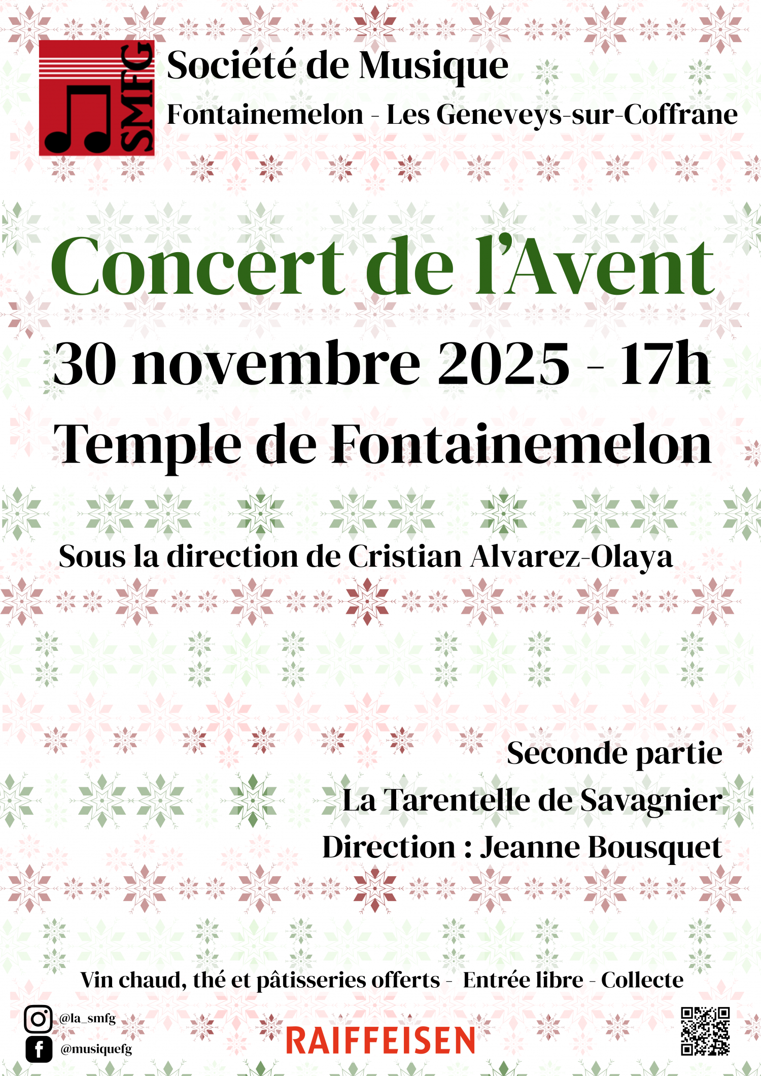 La Société de Musique de Fontainemelon-les Geneveys-sur-Coffrane vous invite à son traditionnel concert de l'Avent le dimanche 30 novembre à 17h. La seconde partie de la soirée sera animée par la chorale la Tarentelle de Savagnier.