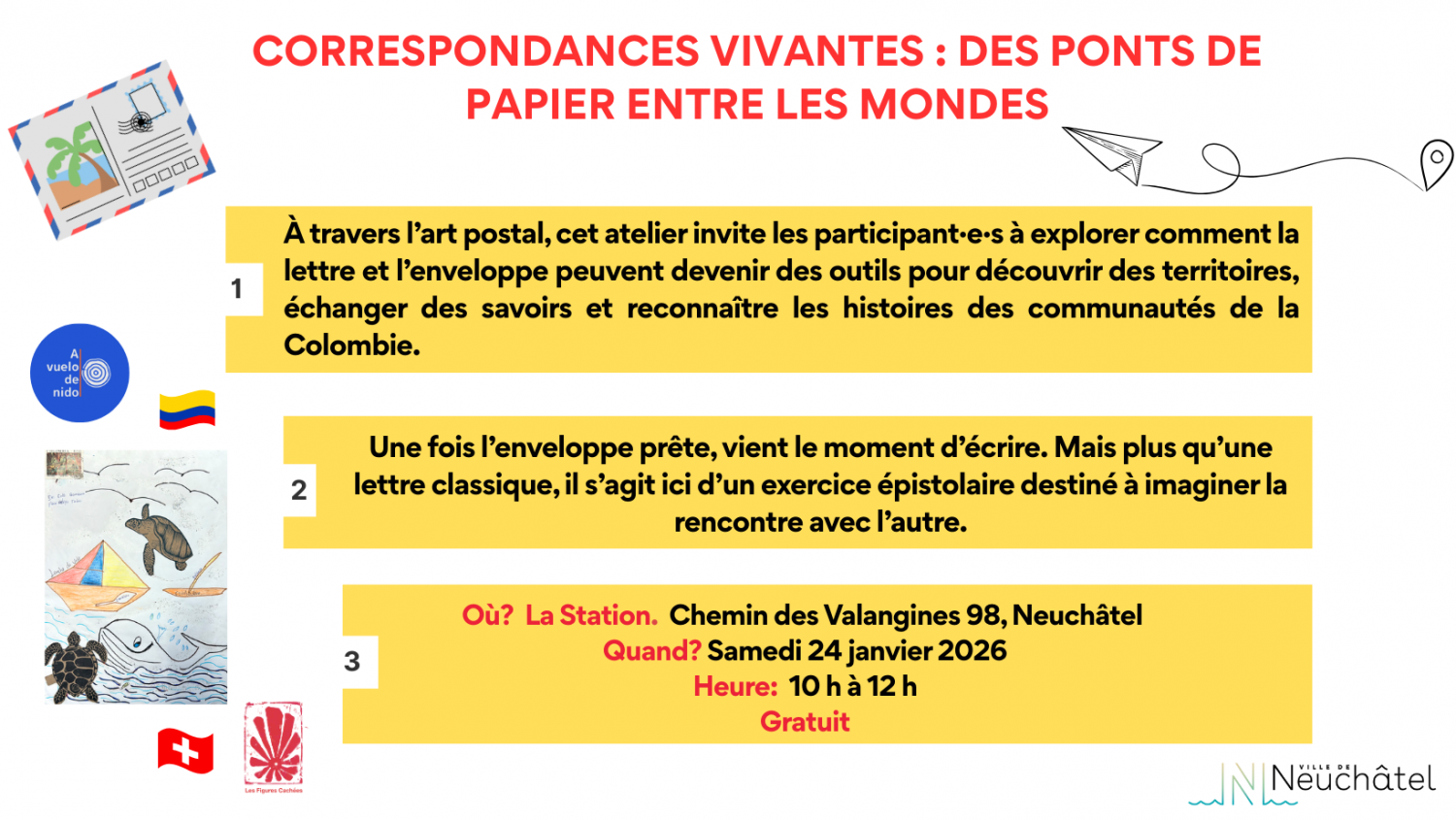 Un échange de lettres entre l’organisation colombiene « A vuelo de nido » et la Suisse pour découvrir la manière dont les autres vivent leur ville. Il s’agit ici d’un exercice épistolaire destiné à imaginer la rencontre avec l’autre.