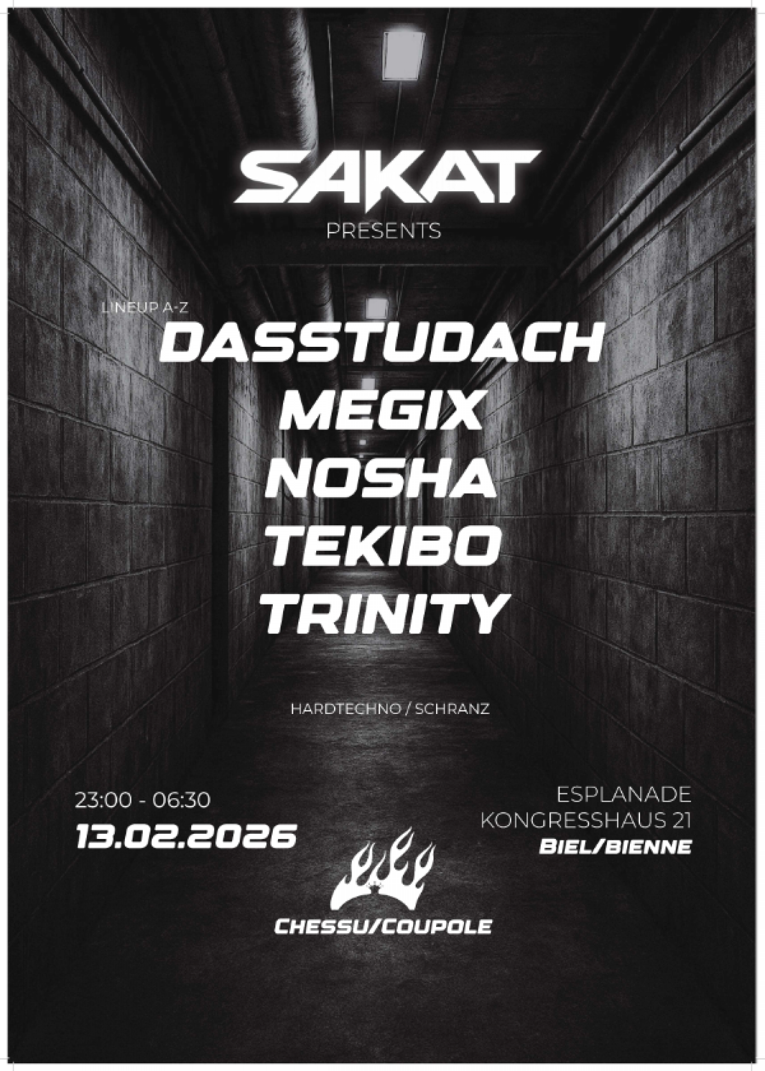 On February 13th, 2026, SAKAT launches its very first event at Chessu Biel. We’re bringing pure hardtechno to the region and creating a space where heavier electronic sounds finally get the attention they deserve.